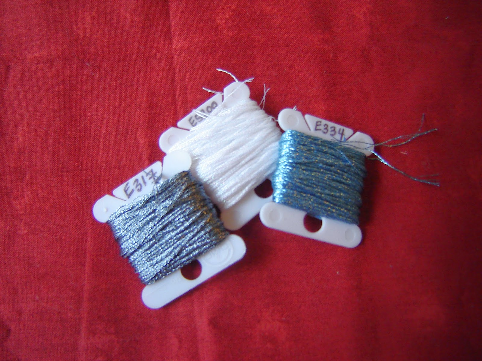 My patterns call for DMC metallic floss. There are other brands out there, but DMC is just the one that I've tried. I like their colors and availability. Here are a few I've picked up at local craft stores.