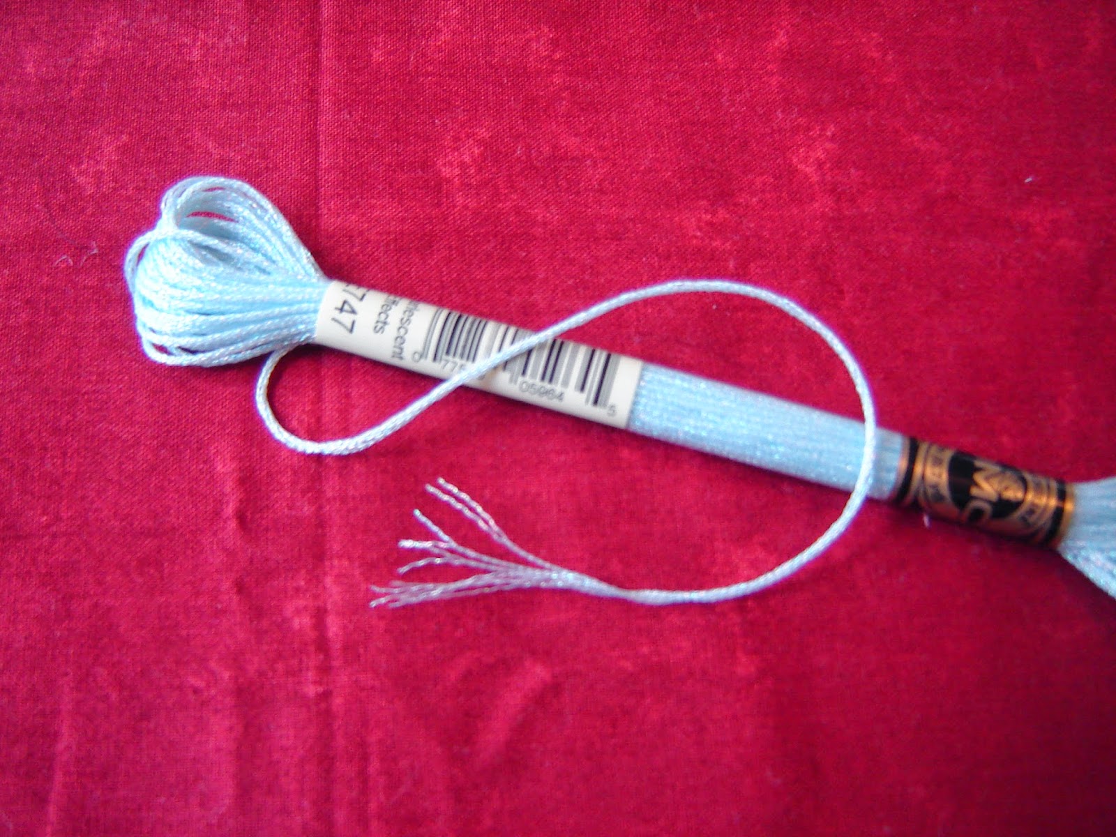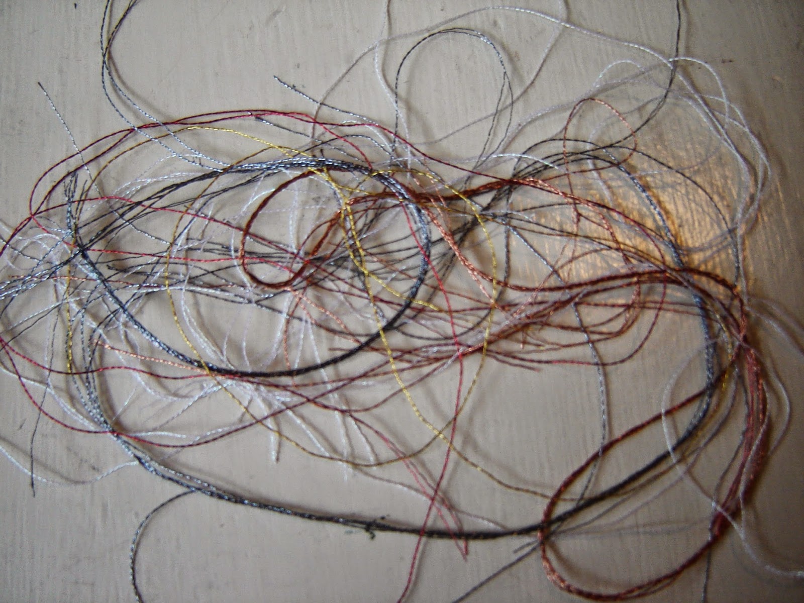 PLAN ON THERE BEING A LITTLE WASTE. It' hard to store this stuff once it's been separated! DMC metallics come in 6-strand skeins, and if you don't use all six strands for a project... well... those leftover strands end up looking like this - pretty but not all that functional. When I start a new project, I always start with a fresh strand of floss.
