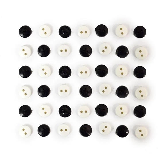 A combination of black and white, round, sew-through buttons. 1/4", approximately 40 per package.