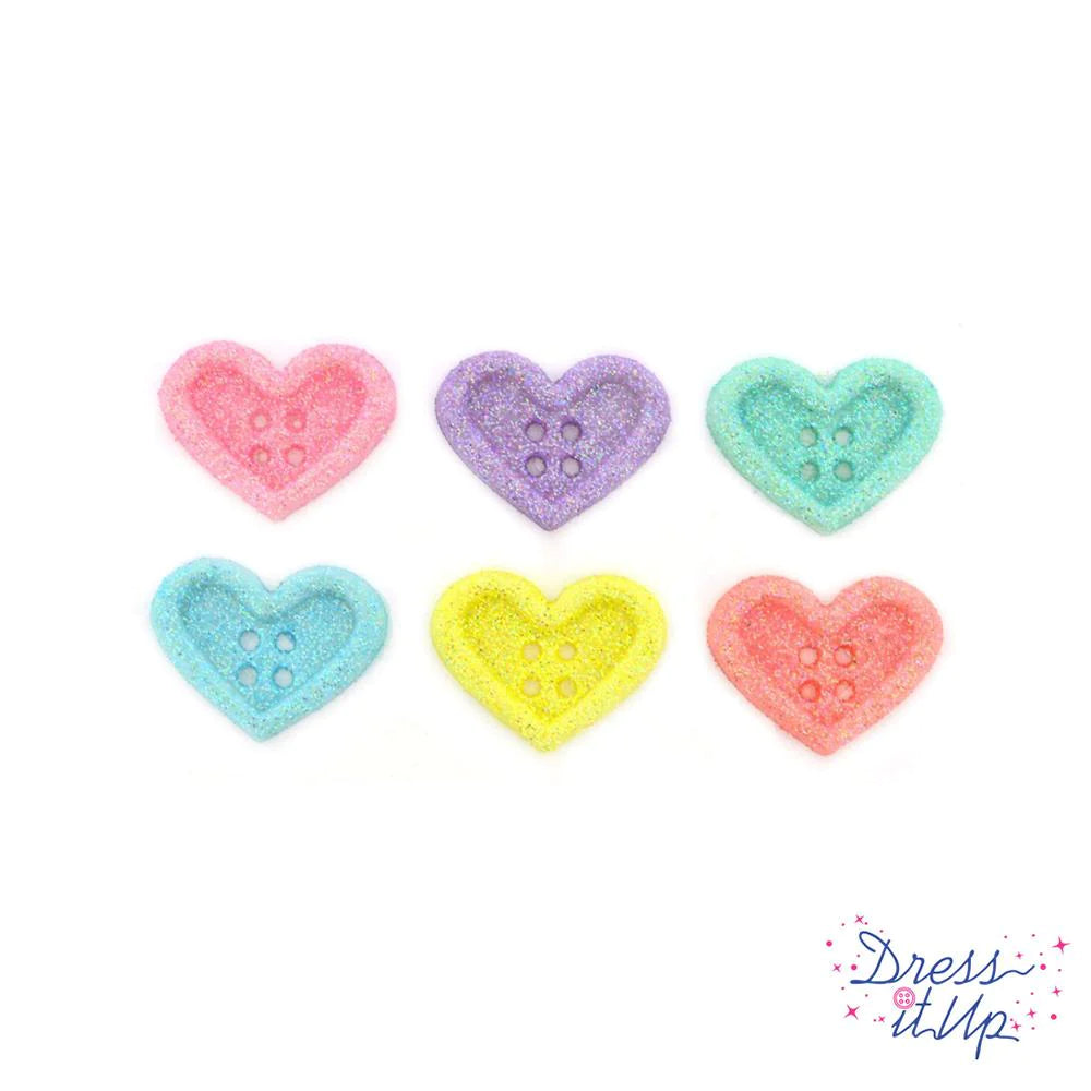 Six, sparkly, pastel, heart-shaped buttons. Approximately 1" across.