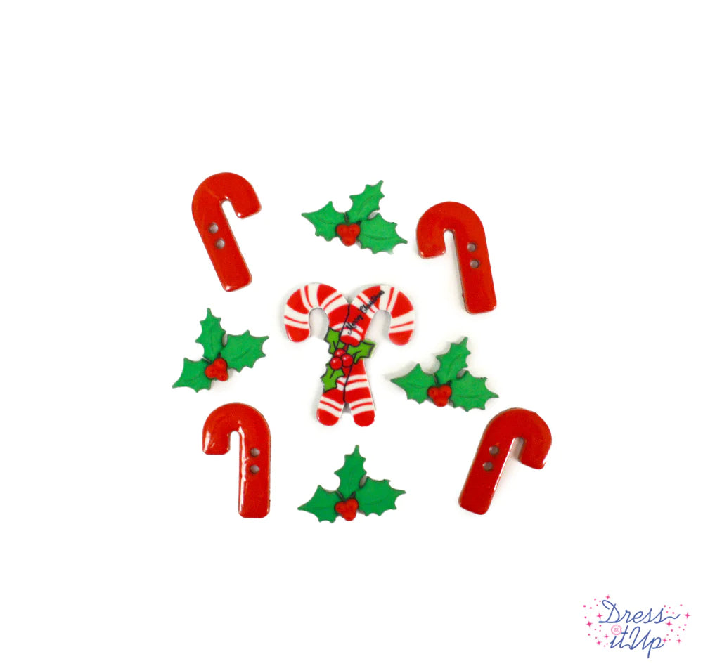 Sweet candy cane and holly buttons. Holly and large candy canes are flat-backed (glue-on). Solid red candy canes are sew-through and approximately 1" tall.