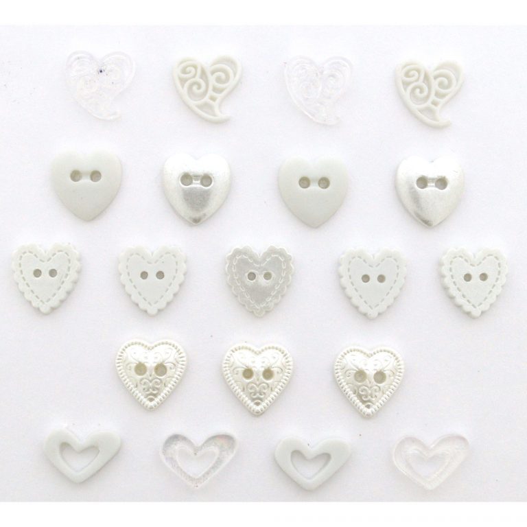 Assorted hearts in white and silver, some sew-through buttons, some flat on the back. 1/4" to 1/2" in diameter.