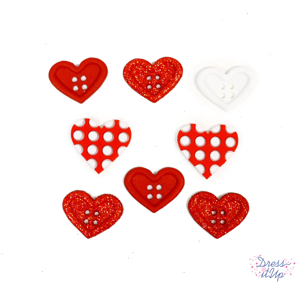 Eight, heart shaped buttons, each approximately 3/4" to 1" tall and wide. This pack varies from the picture a bit and includes 4 of the red sparkly buttons and 4 of the polka dot, flat-backed (glue-on) embellishments.