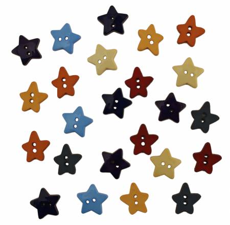 Sew-through star buttons in a variety of colors and sizes. This is a variety pack with even more sizes than shown; colors include pale blue, maroon, gold, and cream.
