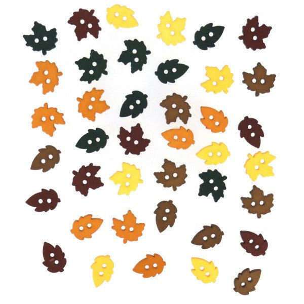 Small sew-through leaf buttons in assorted fall colors. 1/2". Some packages may not include the maple leaf shape.