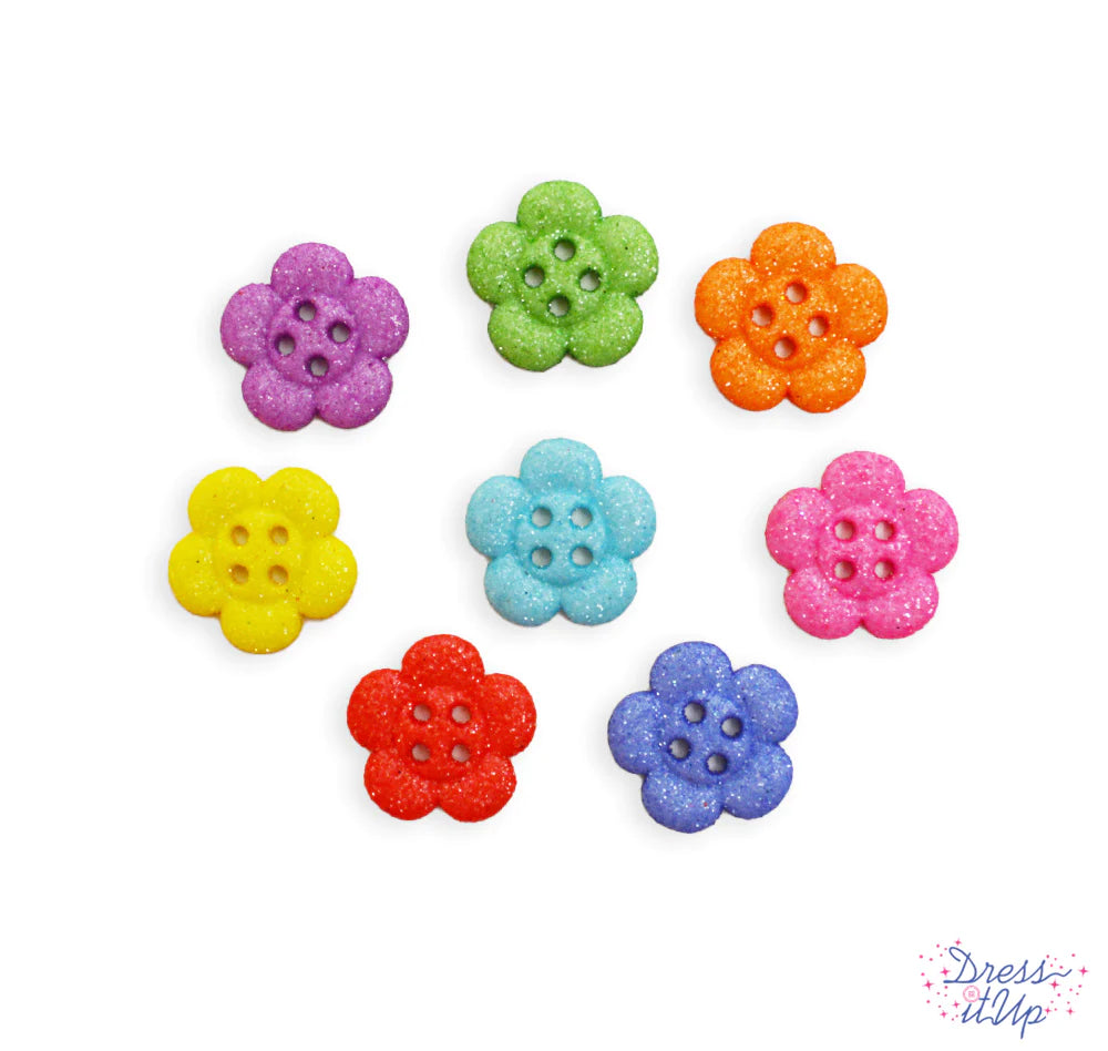 Eight sparkly flower buttons in rainbow shades. 3/4".
