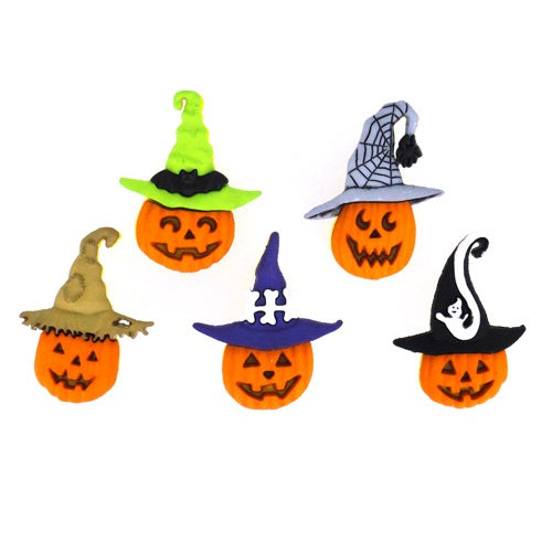 Jack-o'lantern buttons in creatively decorated witches' hats. 1 1/2" tall. Boo!