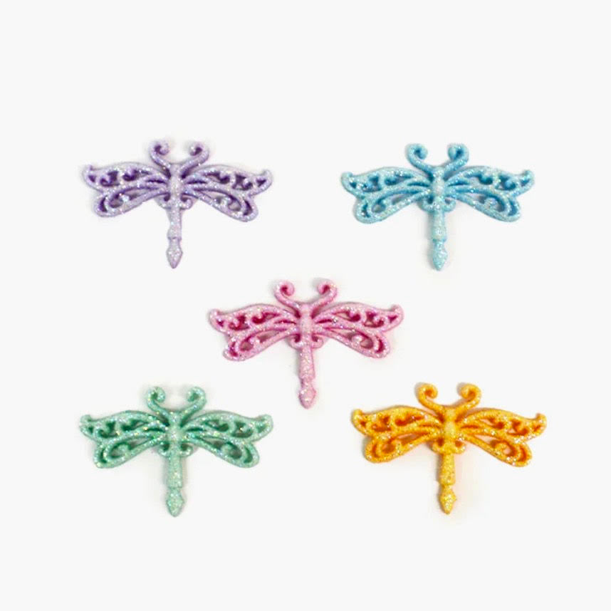 Six spring-colored dragonfly buttons, shank back, about 1 3/8" across. Some are a pretty glitter finish, others matte, colors may vary a bit from the picture.