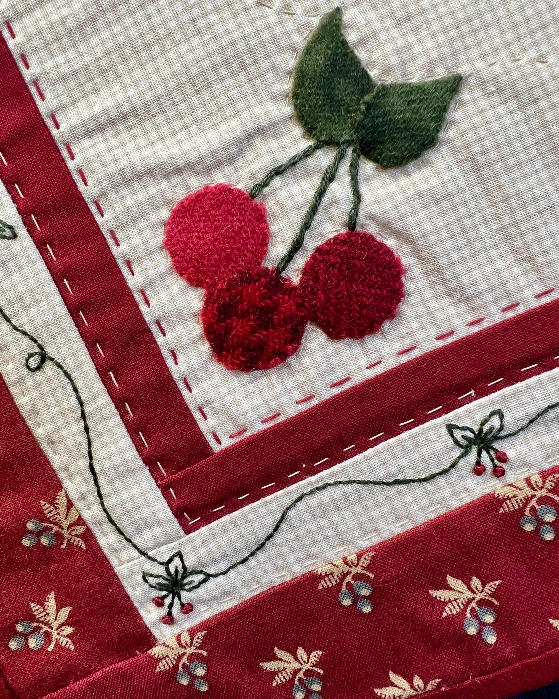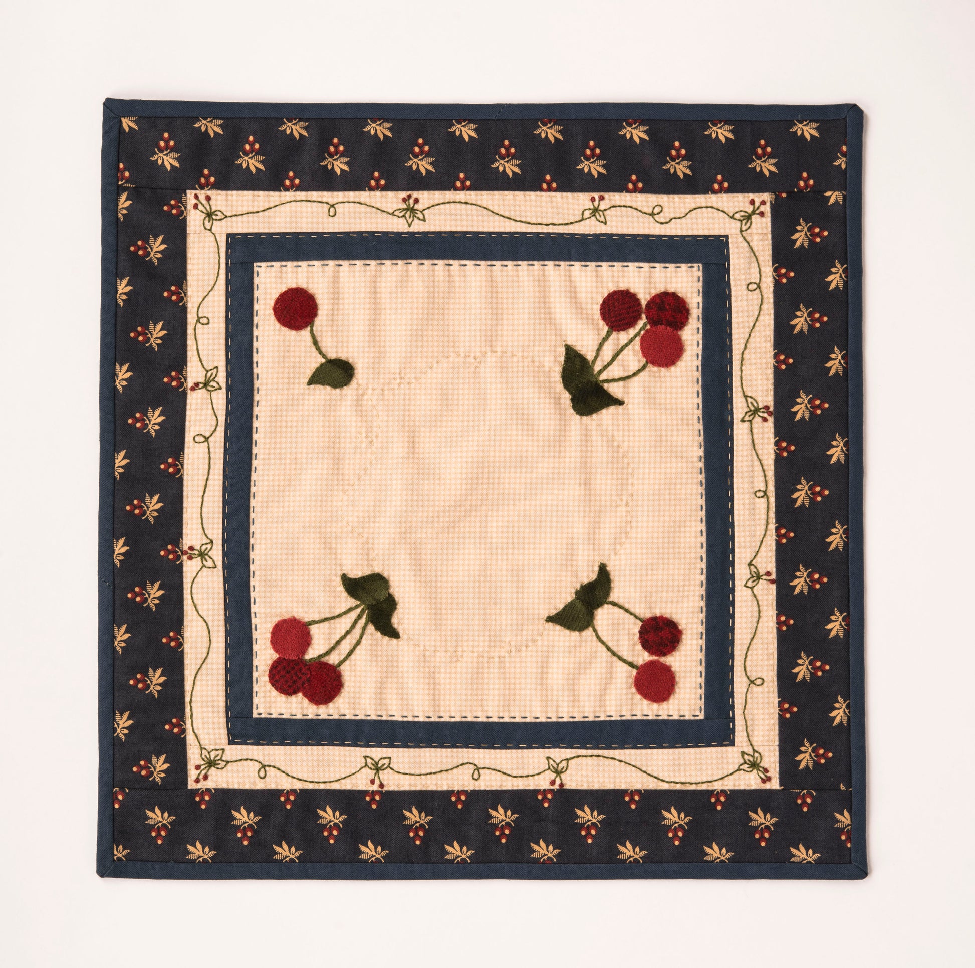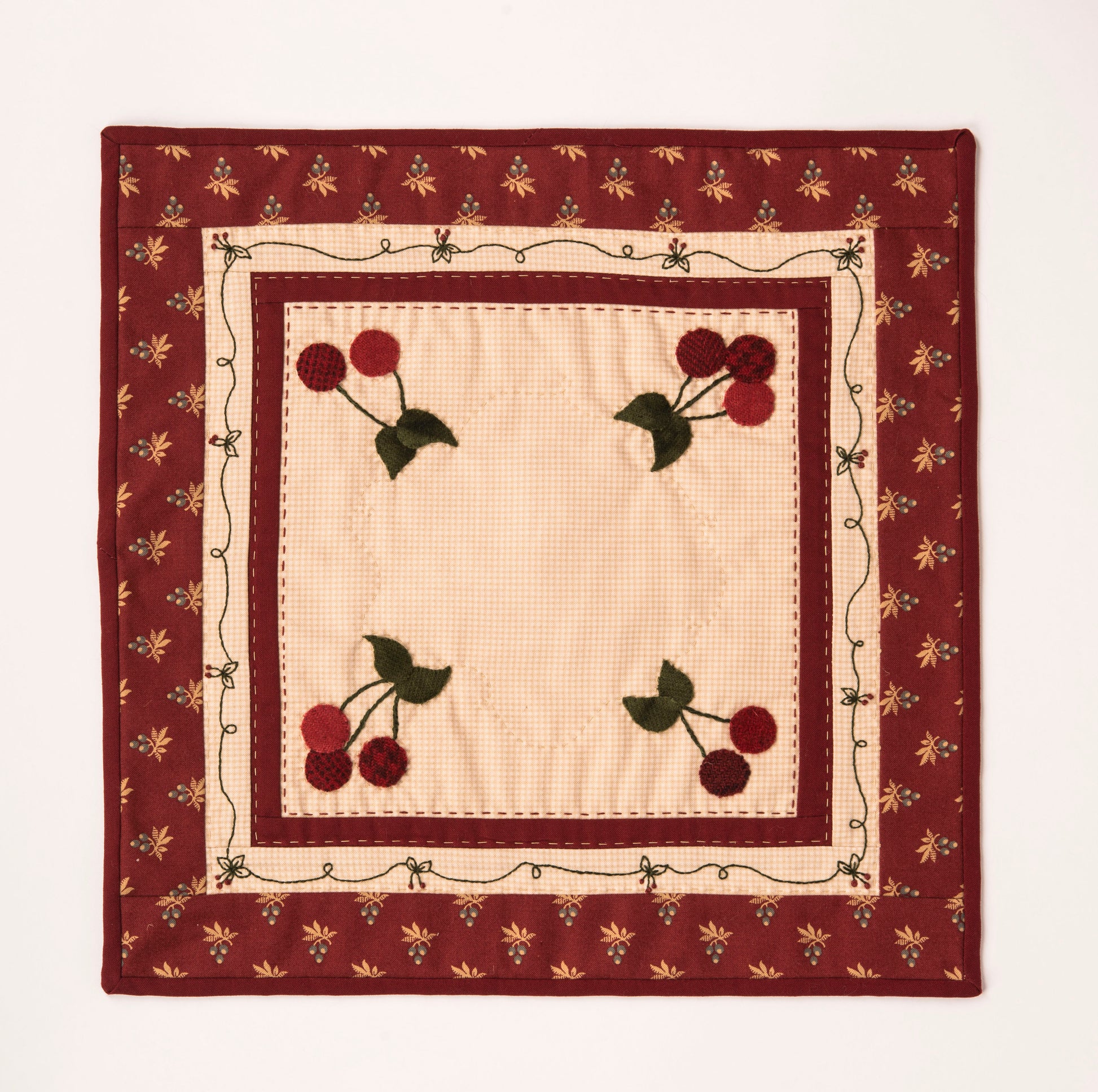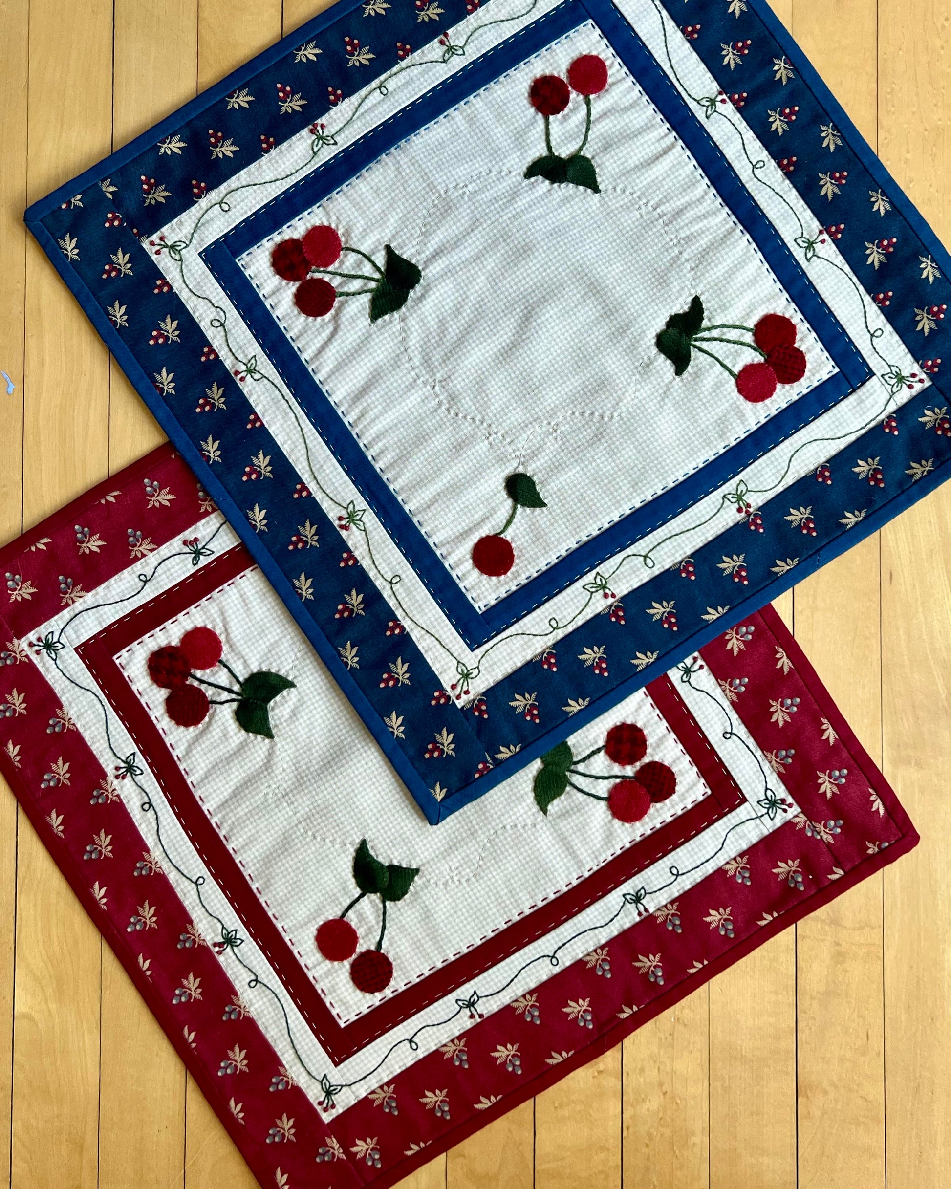 Finished candle mats now available for purchase! Mats are pieced using 100% high-quality, cotton fabrics. Applique is done in wool. Each is hand quilted. Choose from brick red or blue.