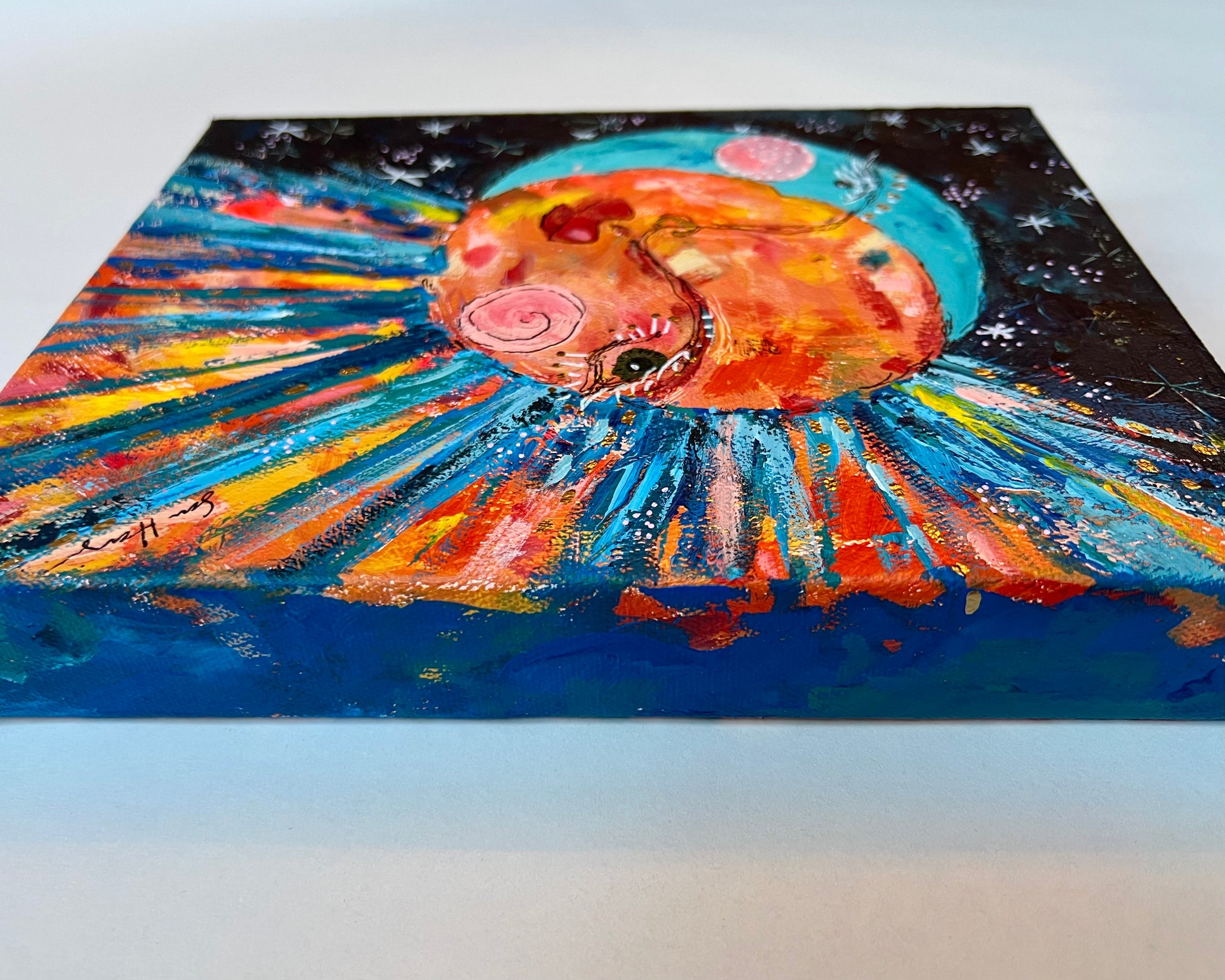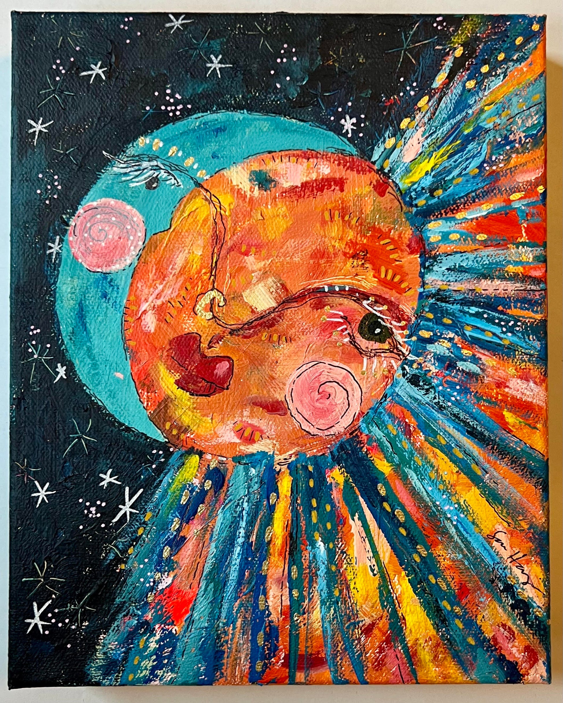8”x10”x1½” acrylic paint and gold oil pen on gallery wrapped, heavy duty canvas. Finished with protective varnish. Edges are painted, and the back is outfitted with a sawtooth hanger, making this piece ready to hang.