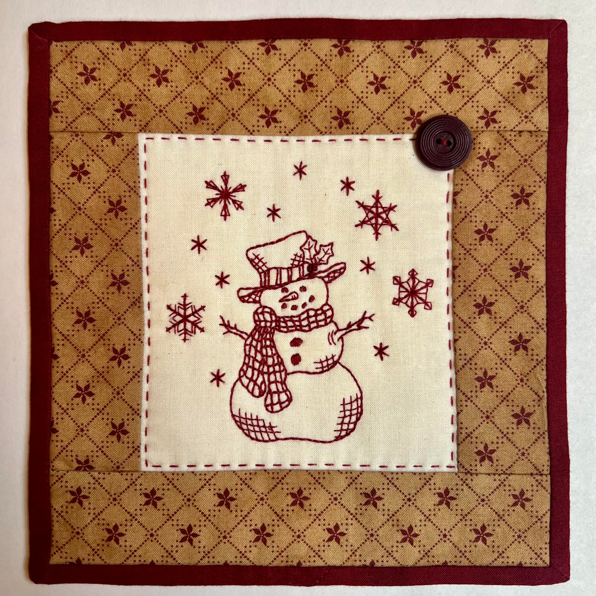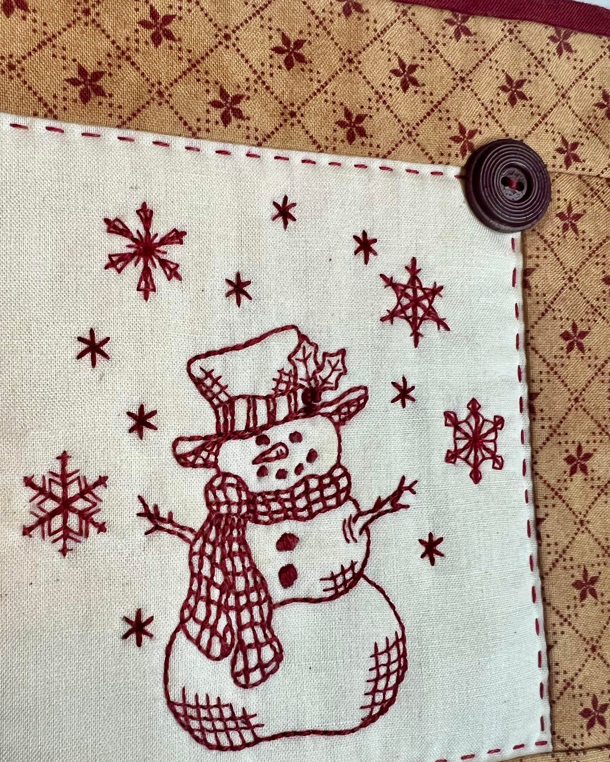 Finished wall hanging was pieced using 100% high-quality, cotton fabrics and embroidered by hand in redwork.