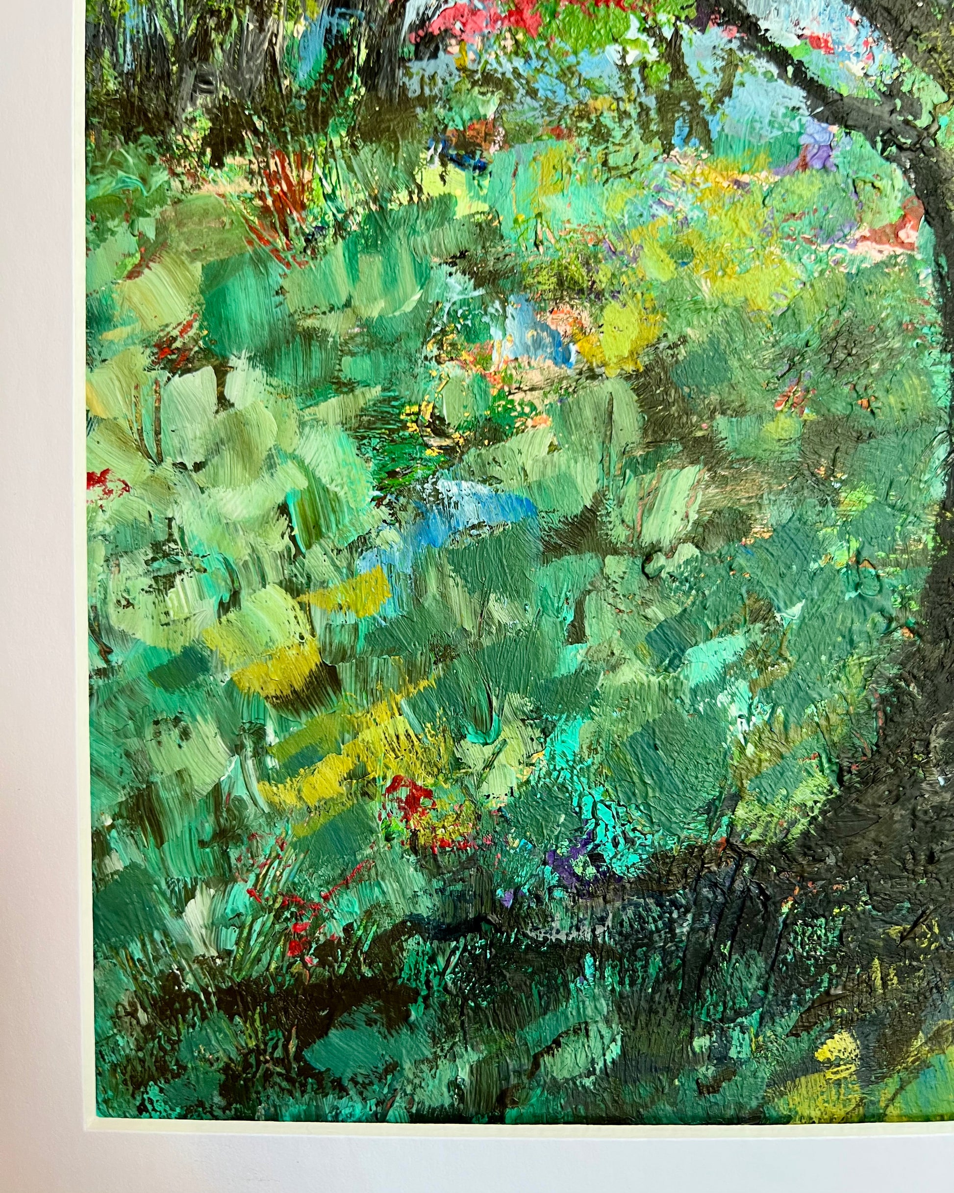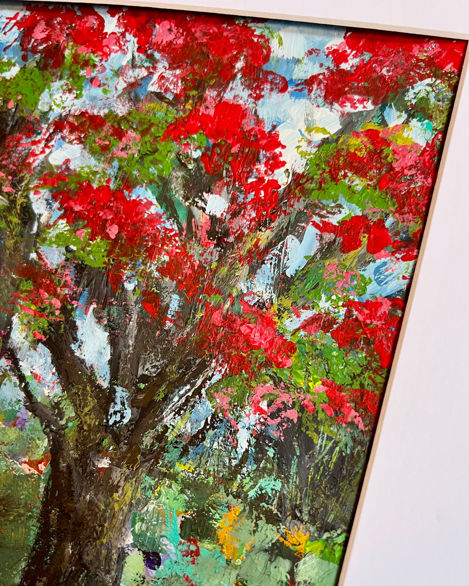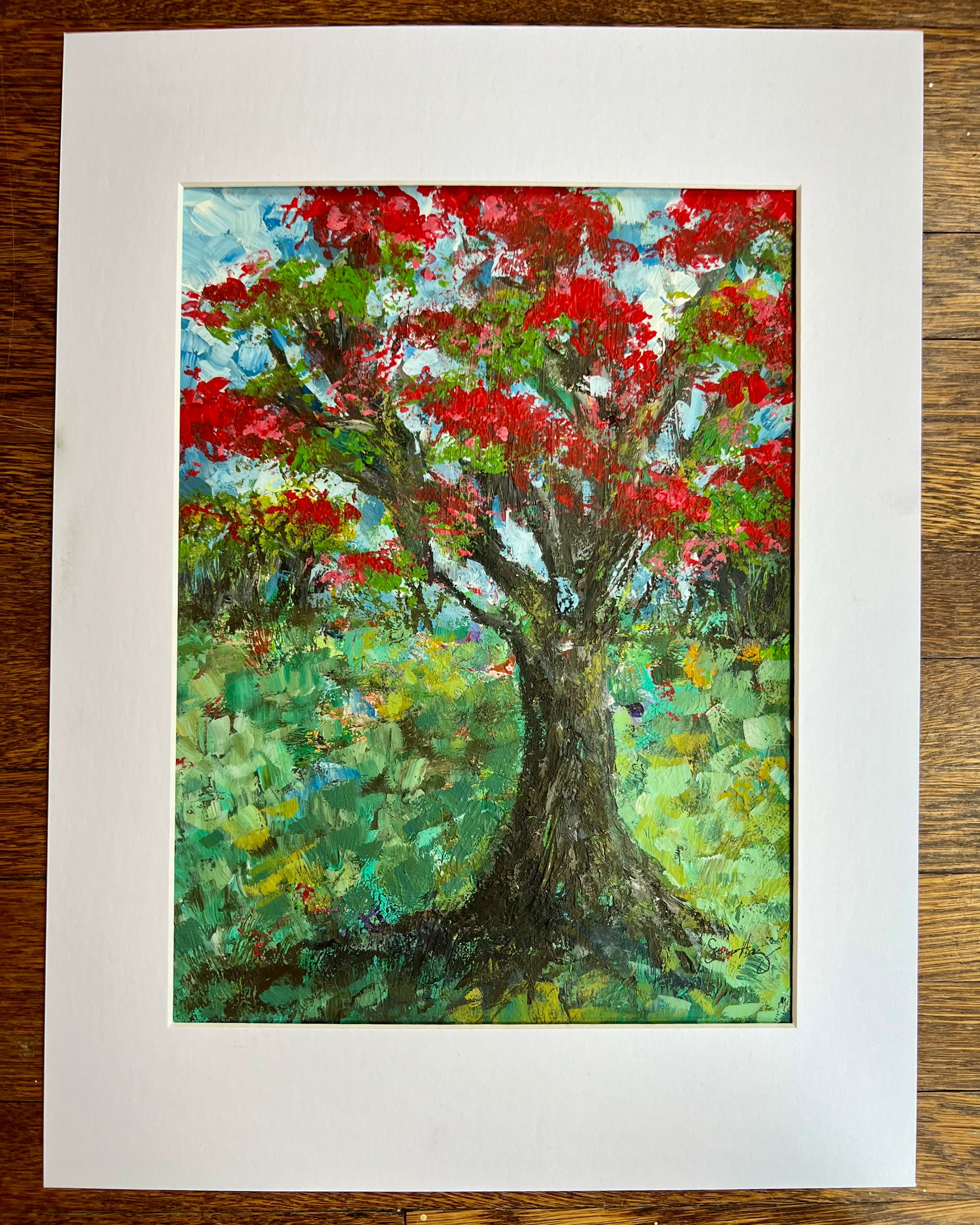 The flamboyant tree grows throughout the Caribbean, Florida, and southern Texas. A lover of the tropics, she's a show stopper who surely lives a happy life. Distinct brush strokes and layered paint give this piece heavy texture and a great variety of color. I could not begin to count the greens on here, not to mention the glimpses of purple, gold, and peach.