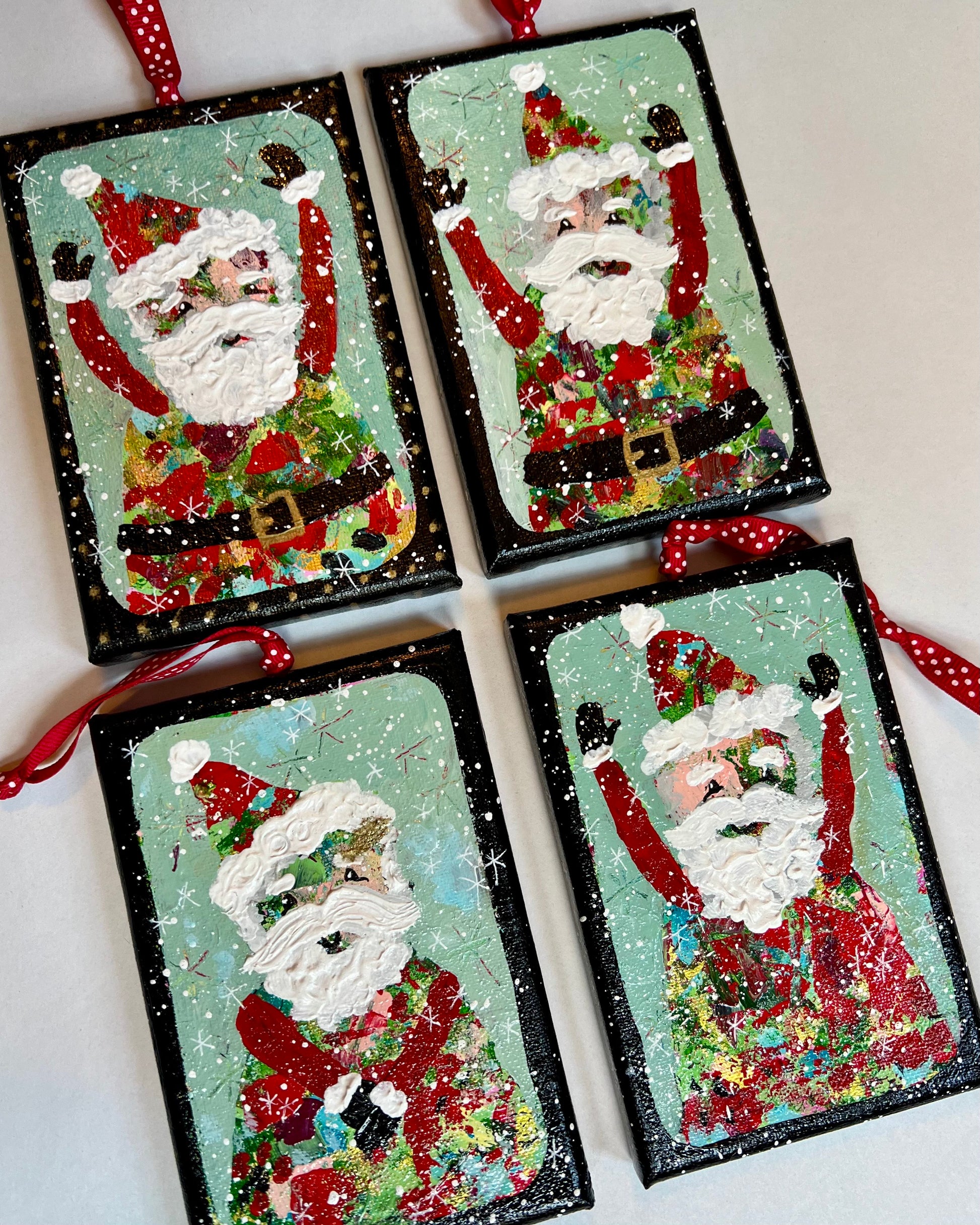 Each is an original- acrylic, glitter, and smeary gold penwork on a 4"x6" wrapped canvas. Varnished to shine and strung with a red polka-dot hanger. Great on a tree or small wall at Christmastime. These are a keepsake ornament, painted with artist-grade materials, meant to last for generations.