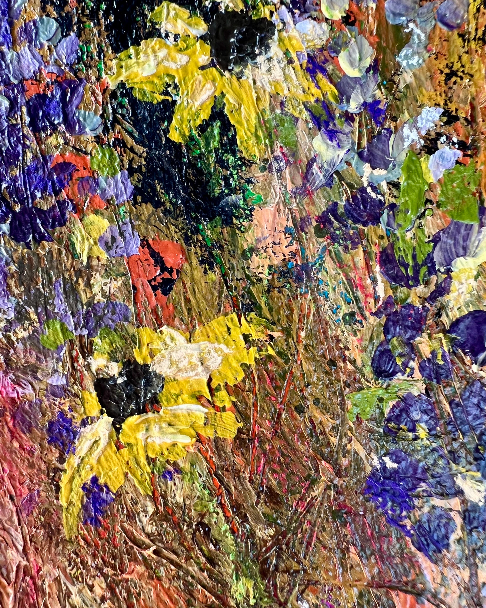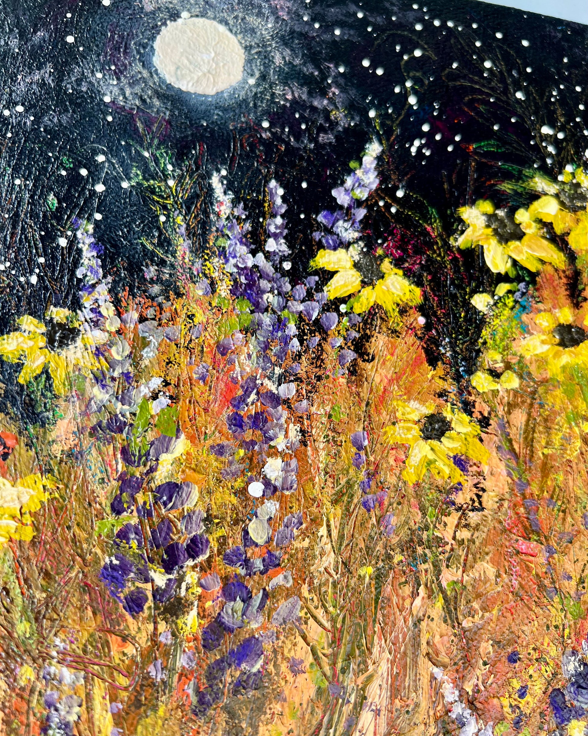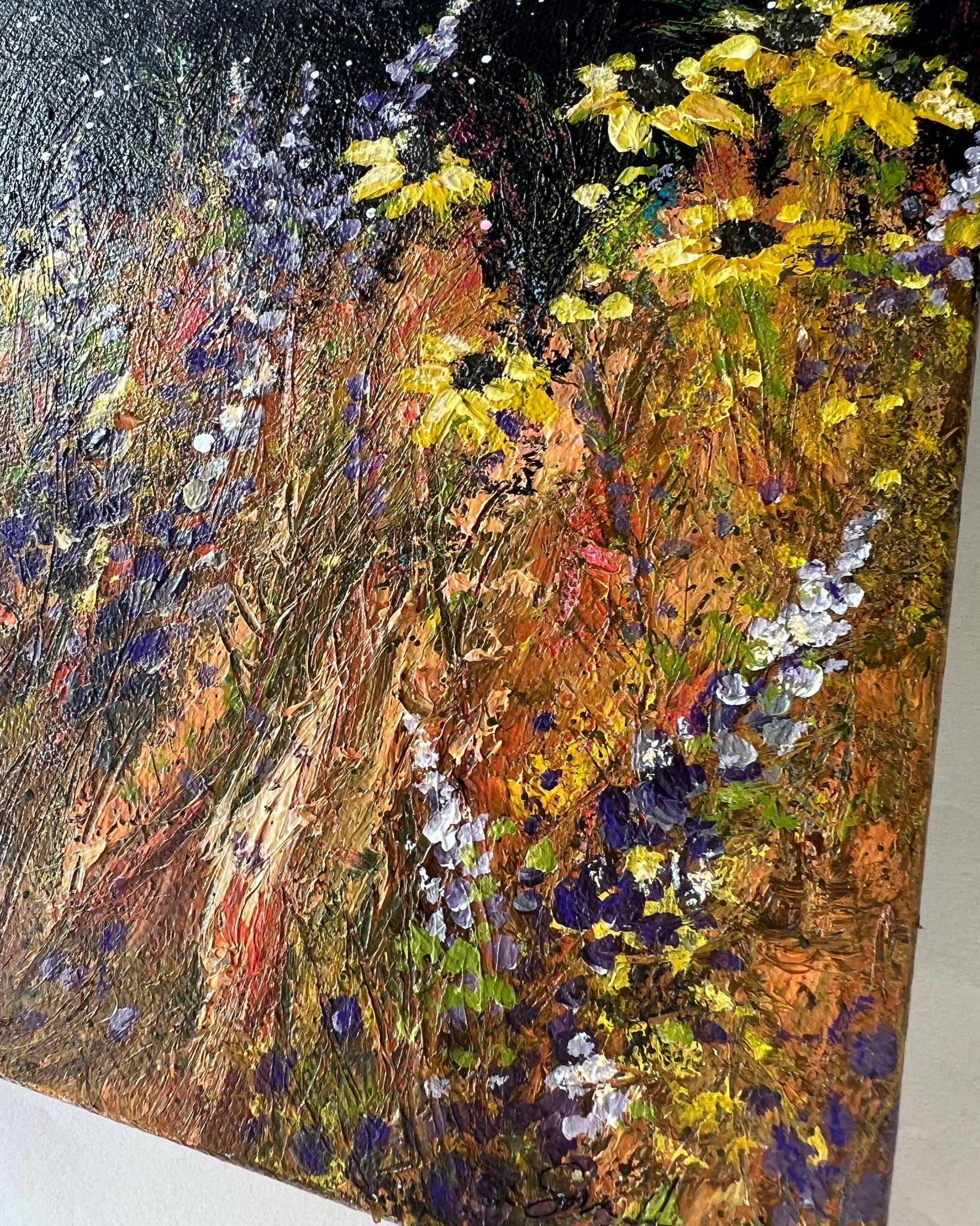 From my Harvest Moon Collection, the purples in this piece absolutely compliment the gold sunflowers. A fall scene that looks like it just can't let go of the colors of summer.