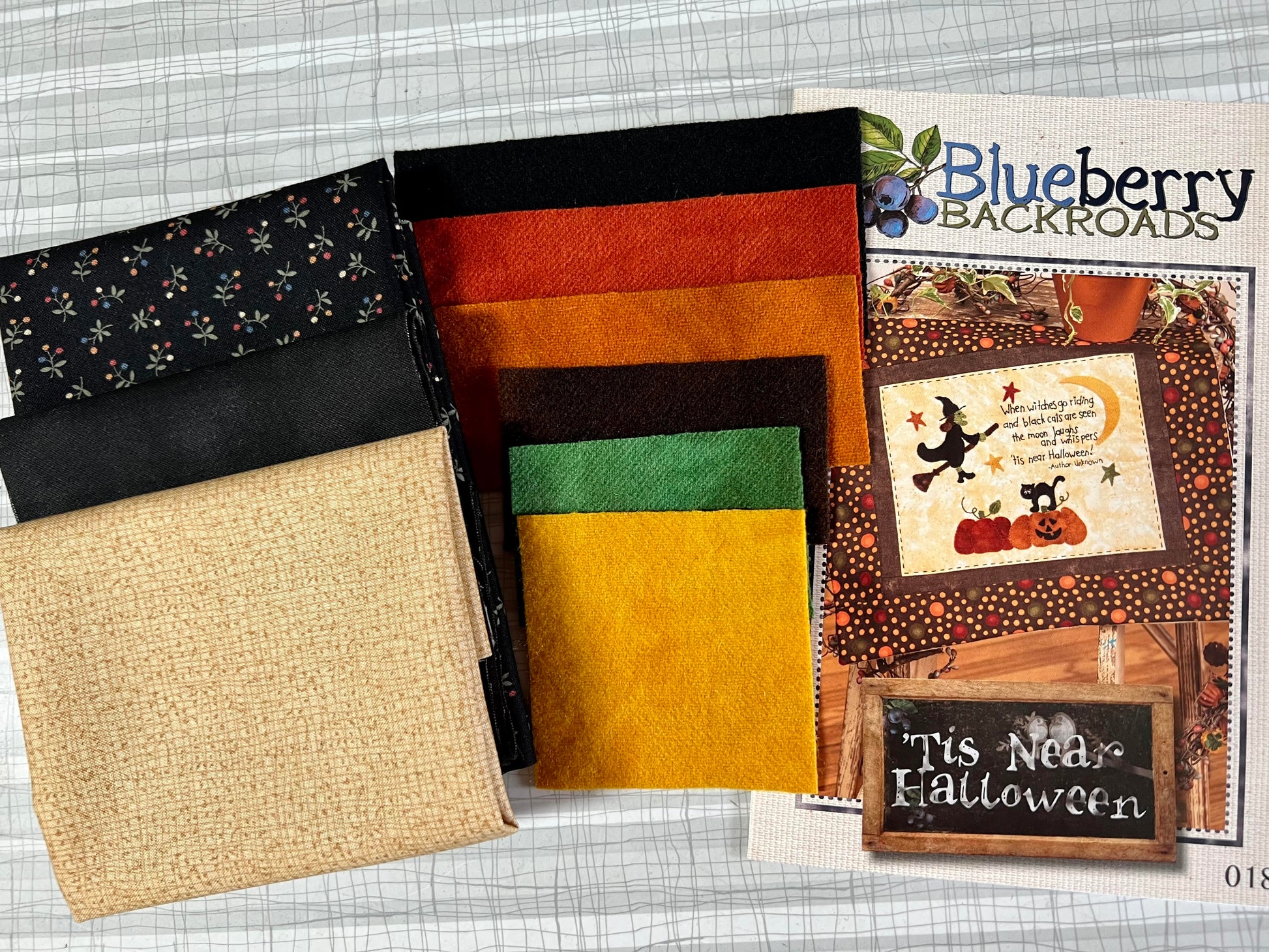 Kit includes pattern, wool for applique, and black fabrics shown. Star button sold separately.