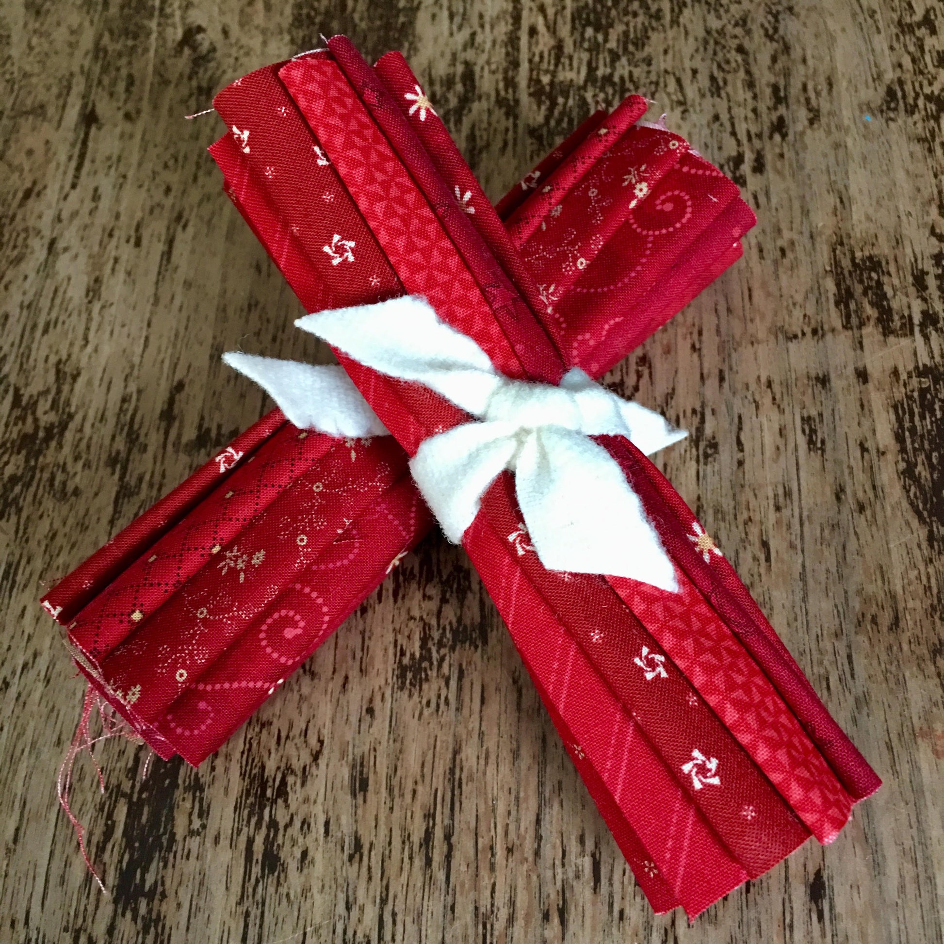 Kit includes pattern, red fabrics for patchwork (may differ from the picture), light colored fabric for inner border, red binding, backing, red wool for applique, and red embroidery floss. Pure sweetness.