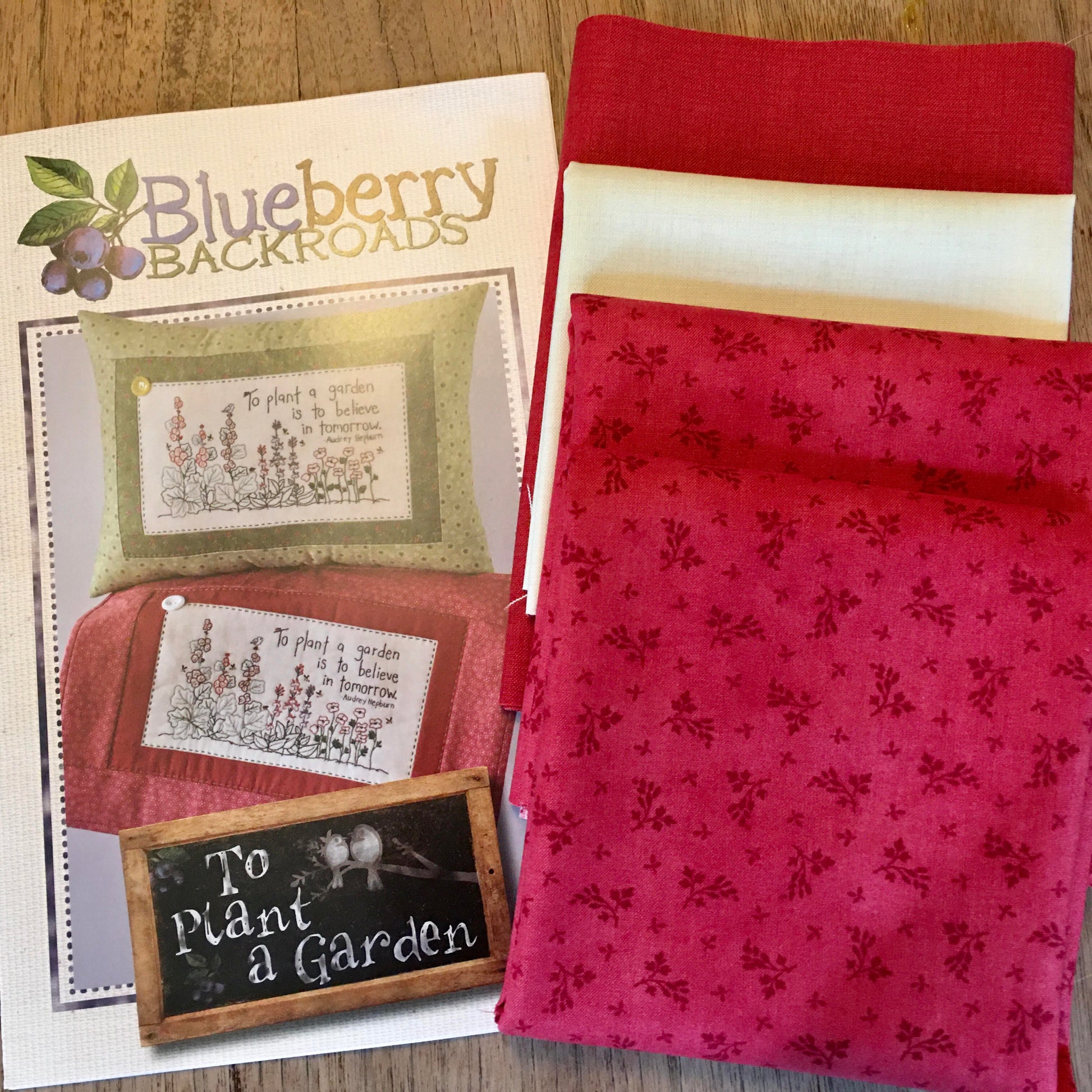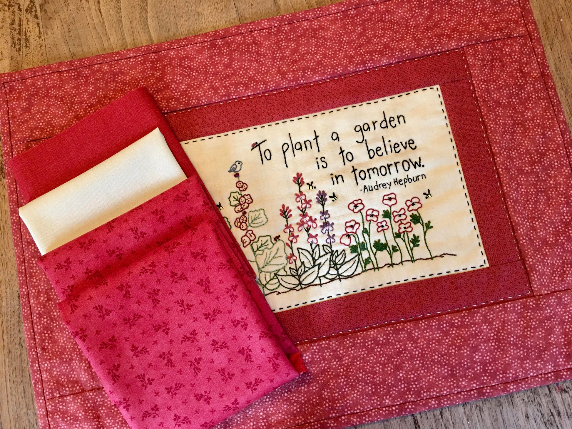 This kit includes pattern, background, and the pinkish-red fabrics shown to make either a pillow or wall hanging (inner border, outer border, binding, and backing).