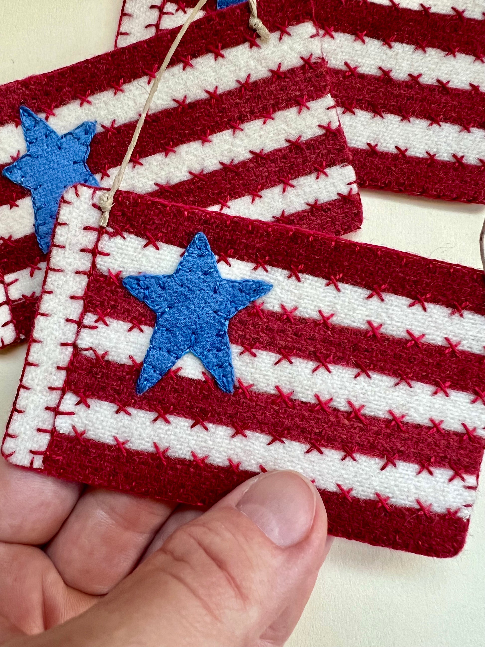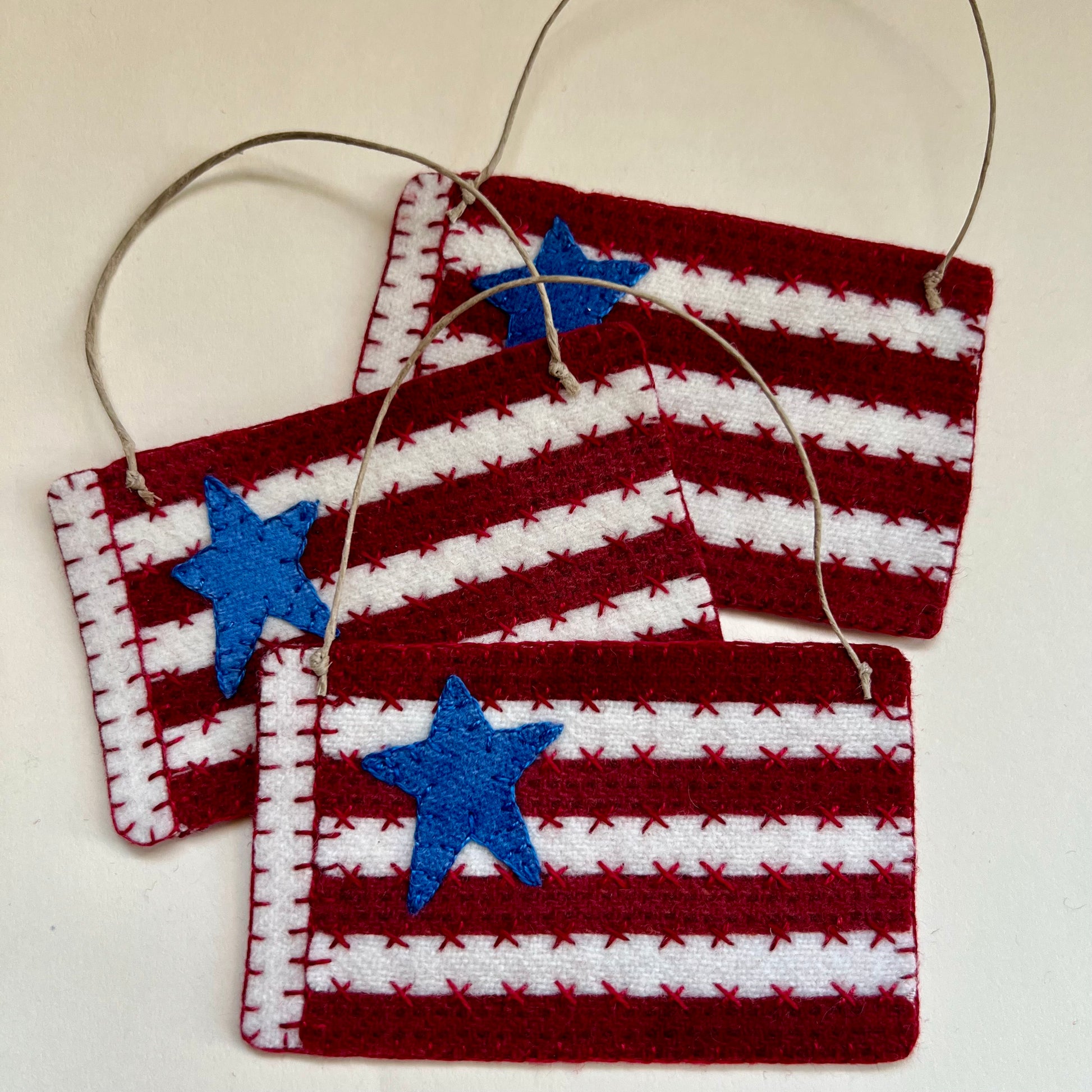 Finished American Flag ornaments, hand stitched using 100% wool and Valdani threads.