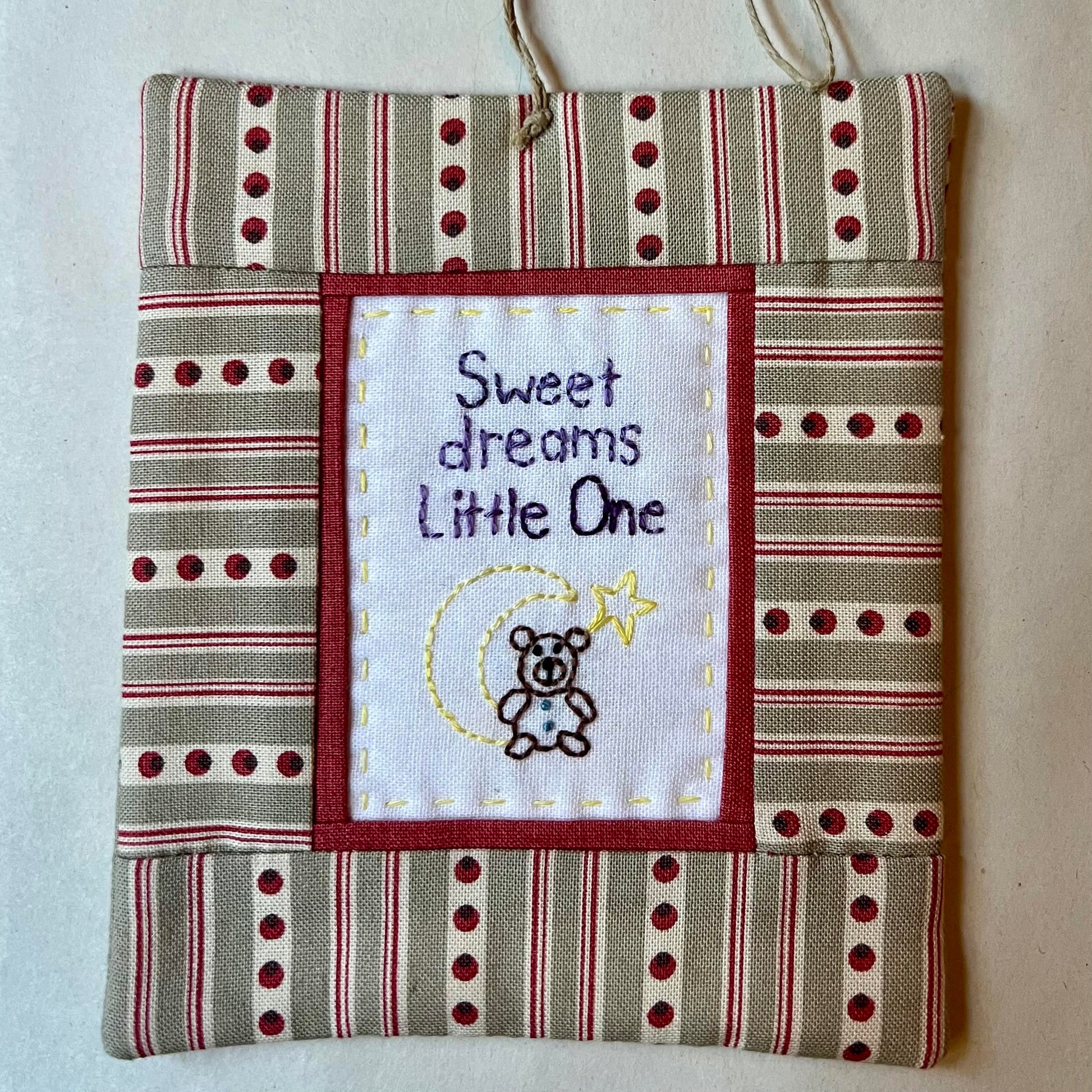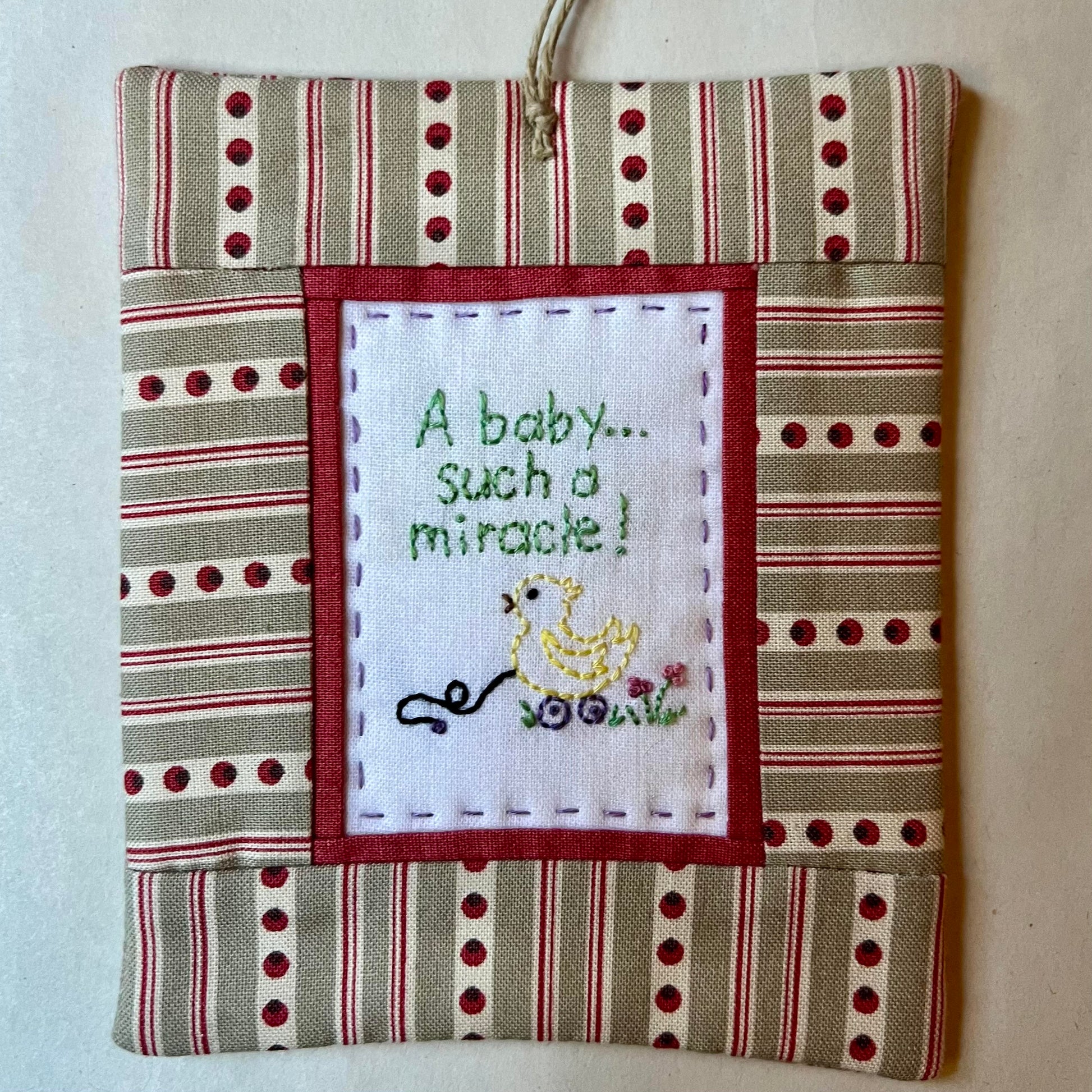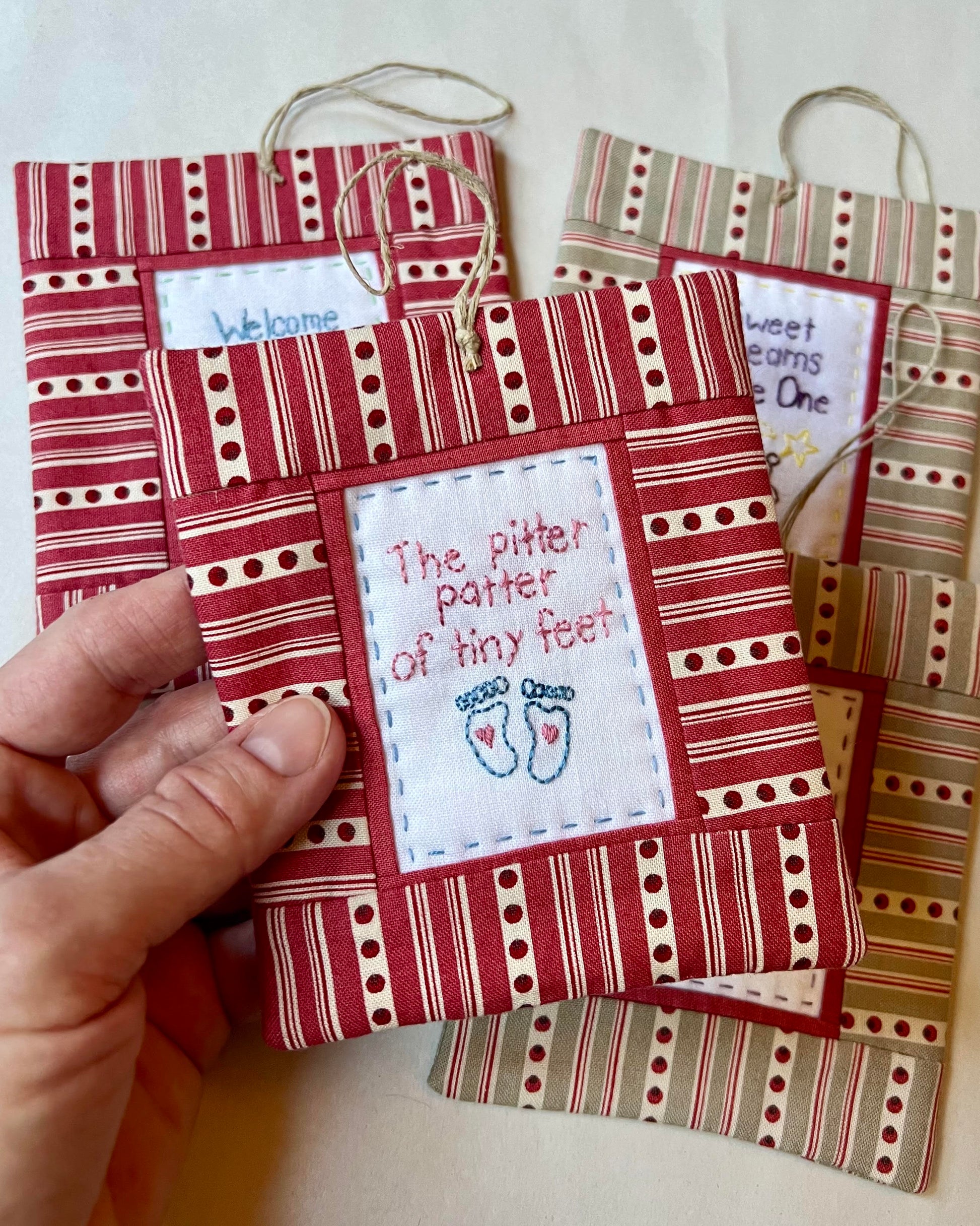 Ornaments are pieced using 100% high-quality, cotton fabrics. Each is embroidered by hand and then hand quilted.