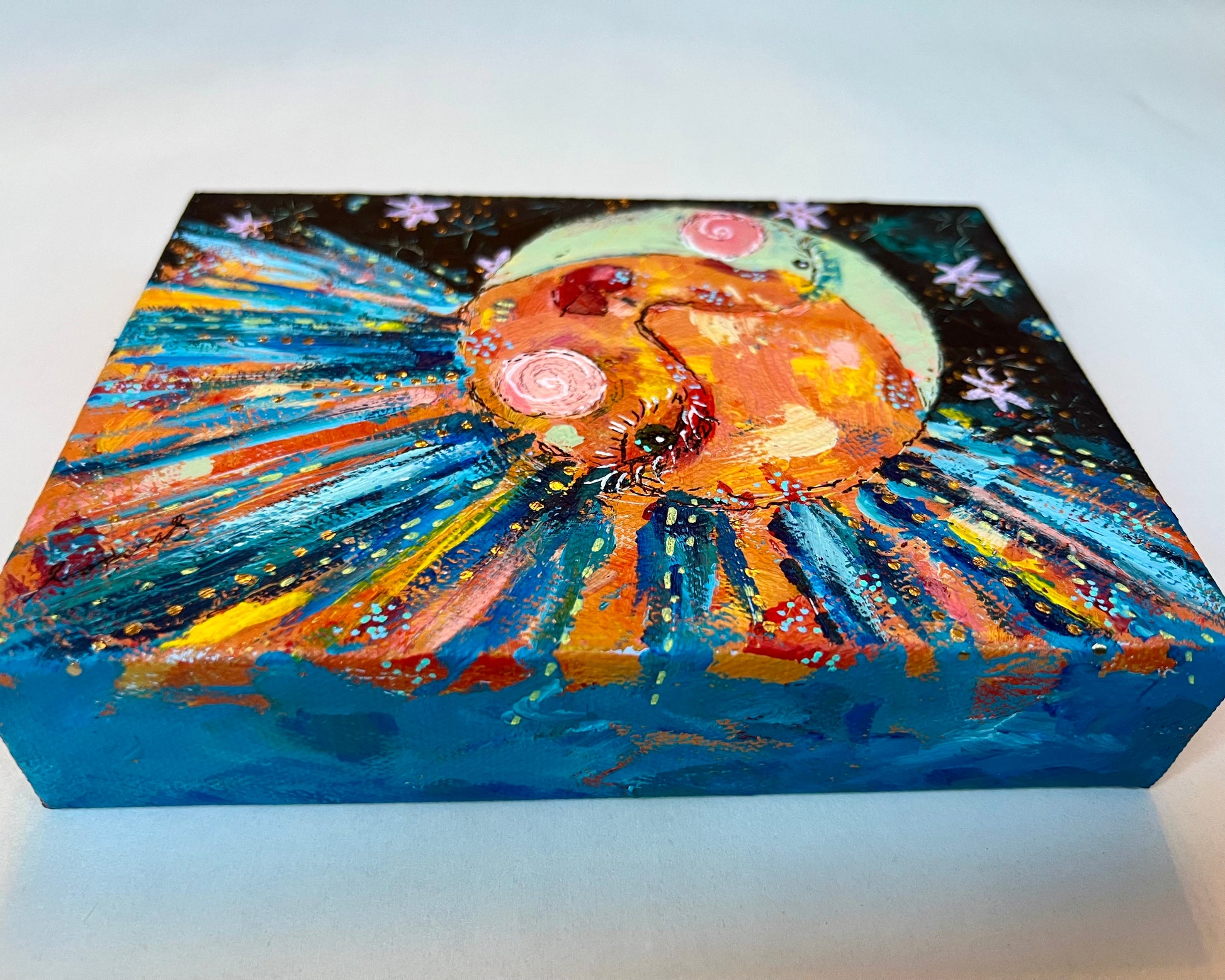 5”x7”x1½” acrylic paint and gold oil pen on gallery wrapped, heavy duty canvas. Finished with protective varnish. Edges are painted, and the back is outfitted with a sawtooth hanger, making this piece ready to hang.