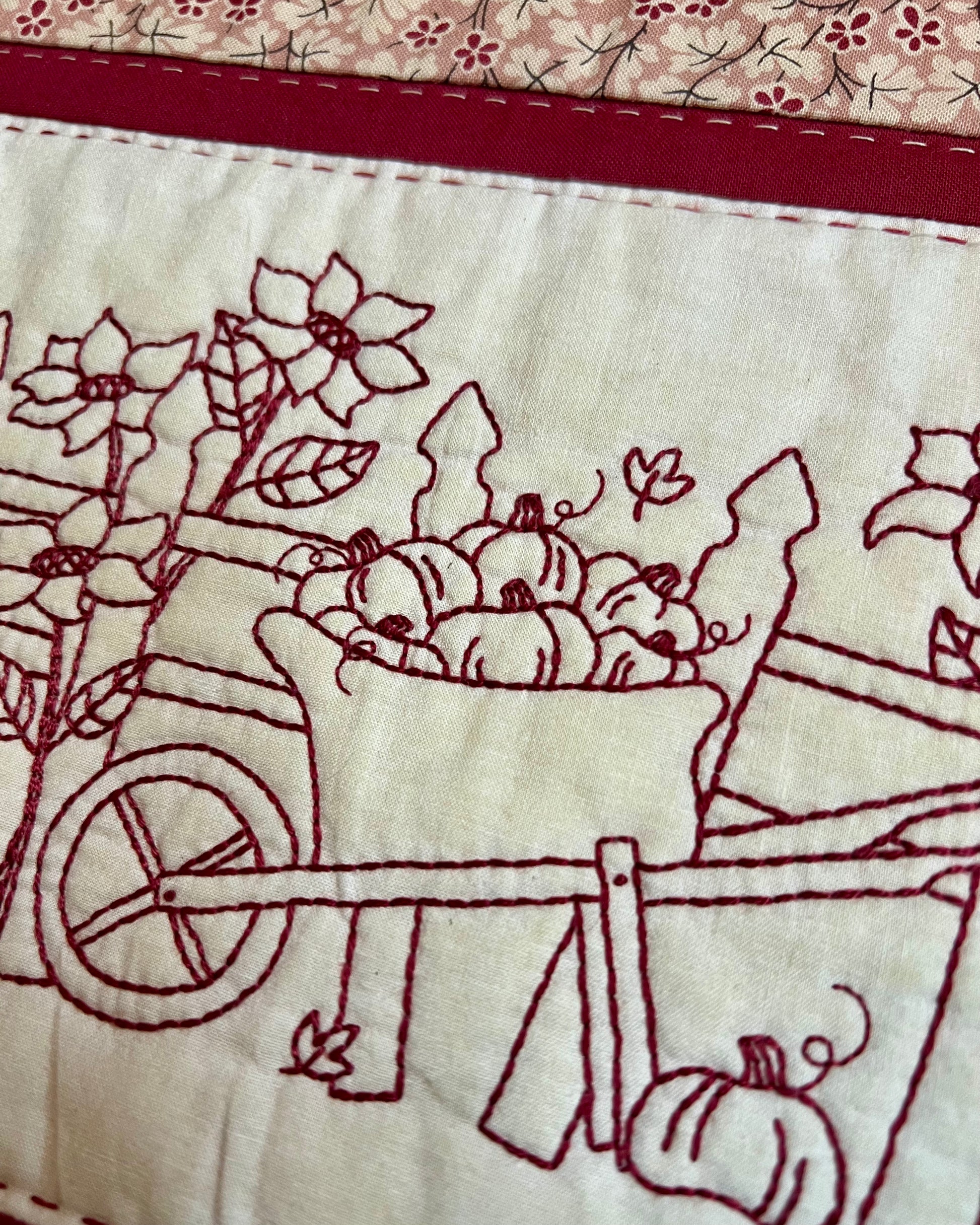 The shades of fall...my favorite colors of the year. Embroider this whimsical fall scene in those colors or in classic redwork. Happy fall!