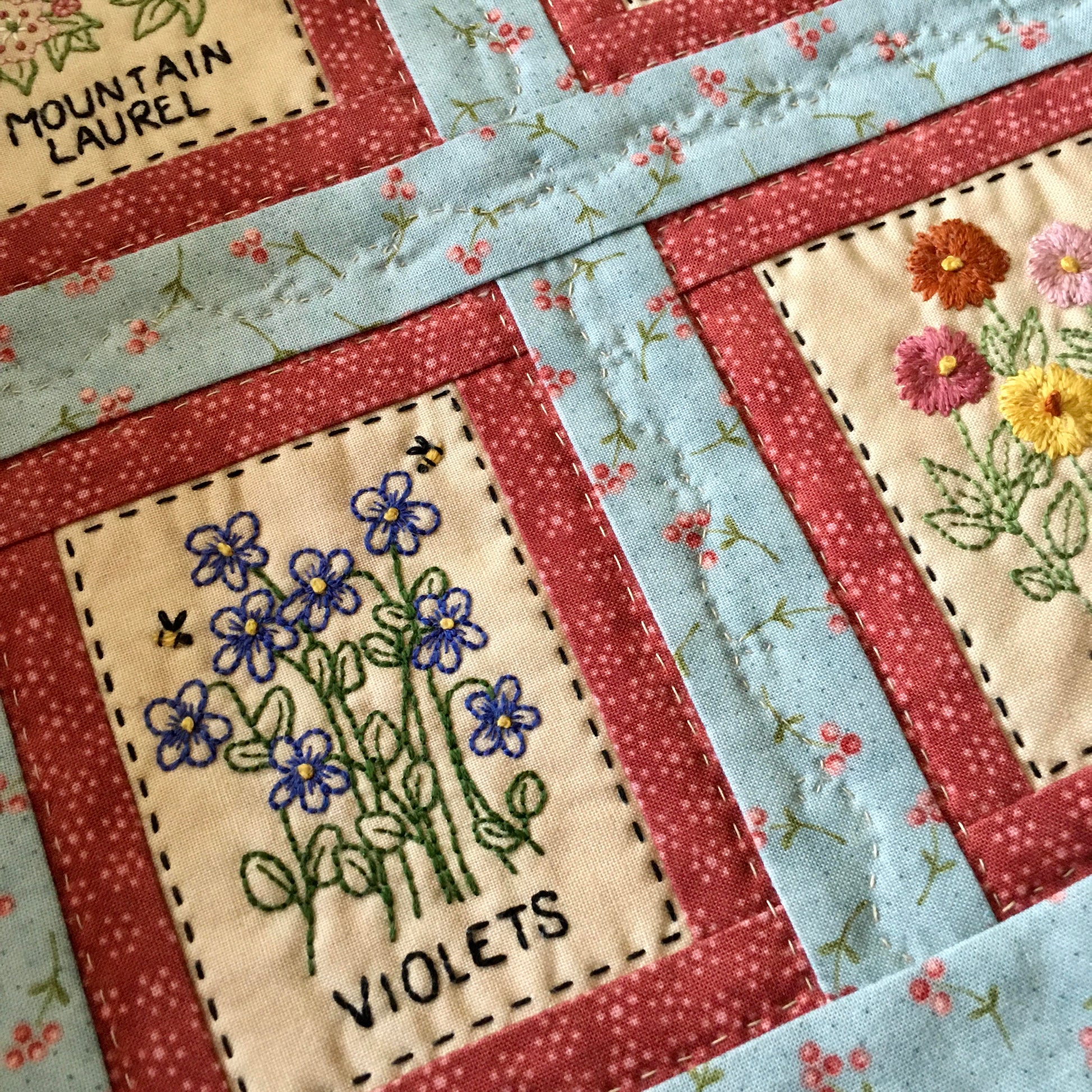 Black-eyed-susans, dahlias, violets, and mountain laurel are the beautiful flowers embroidered on this sampler wall hanging. A cheerful, project for spring!