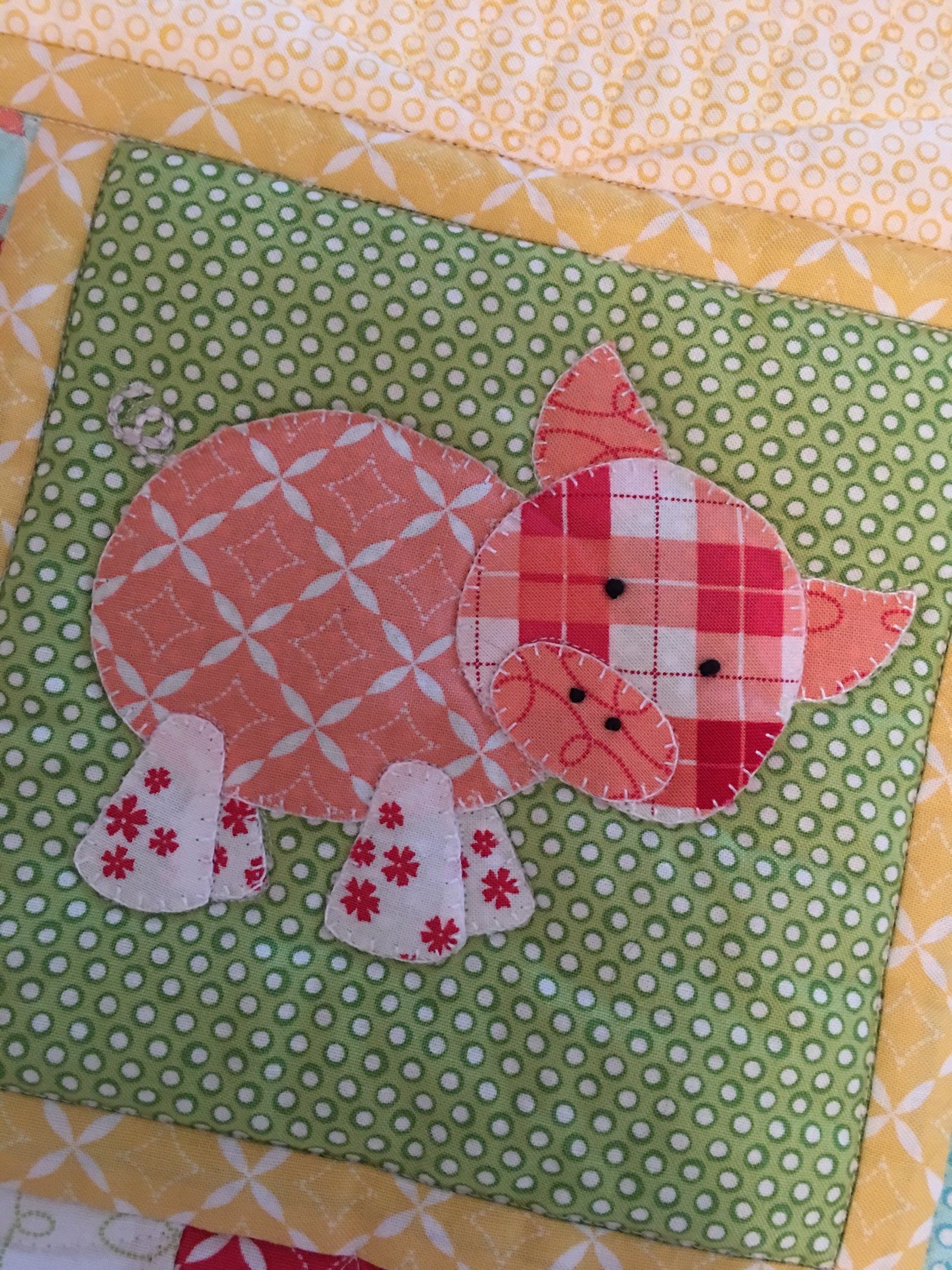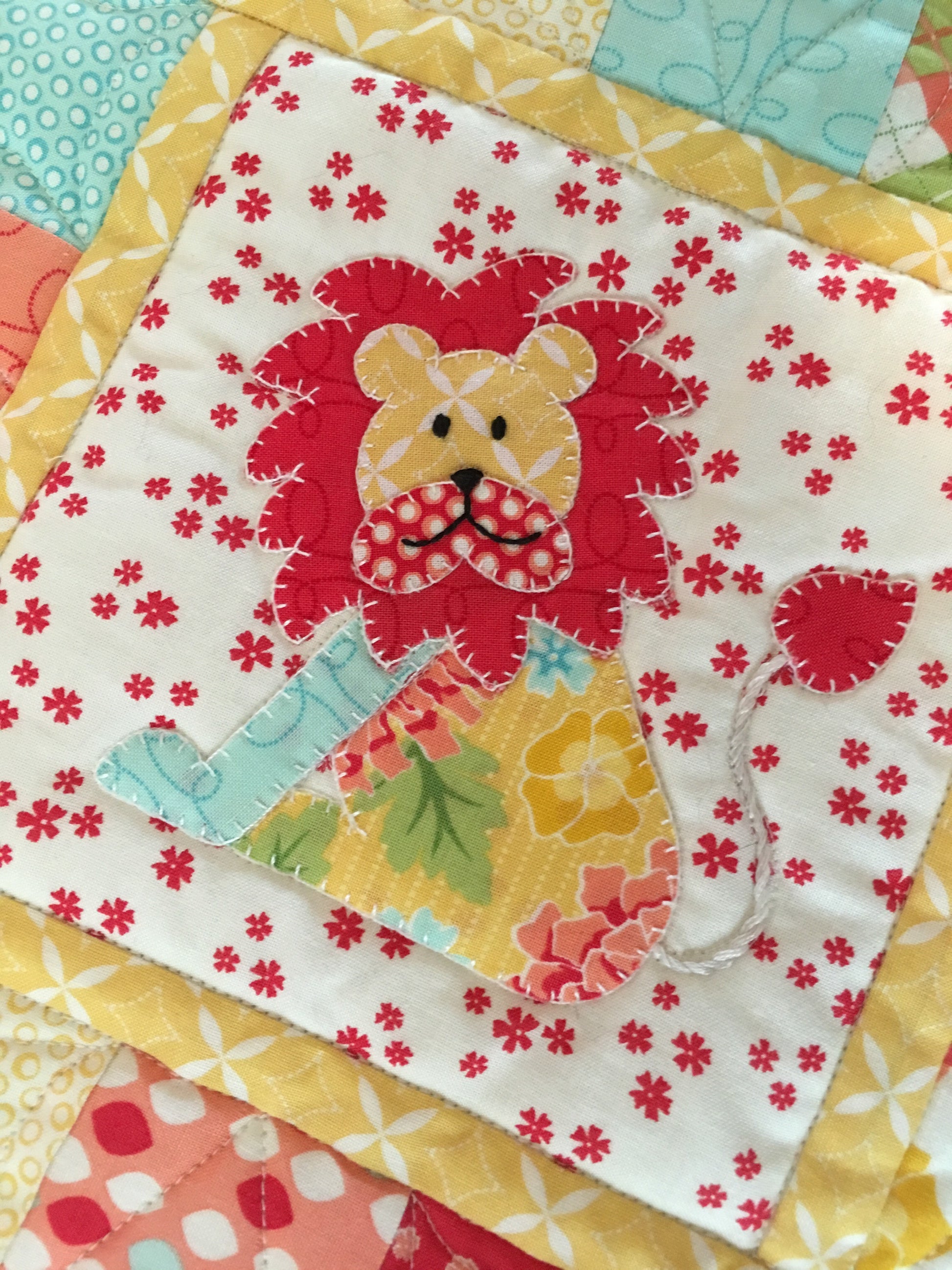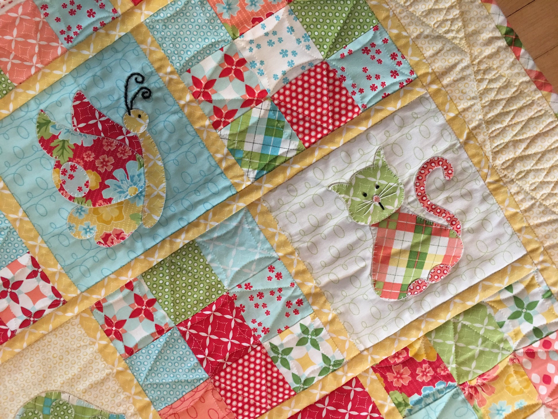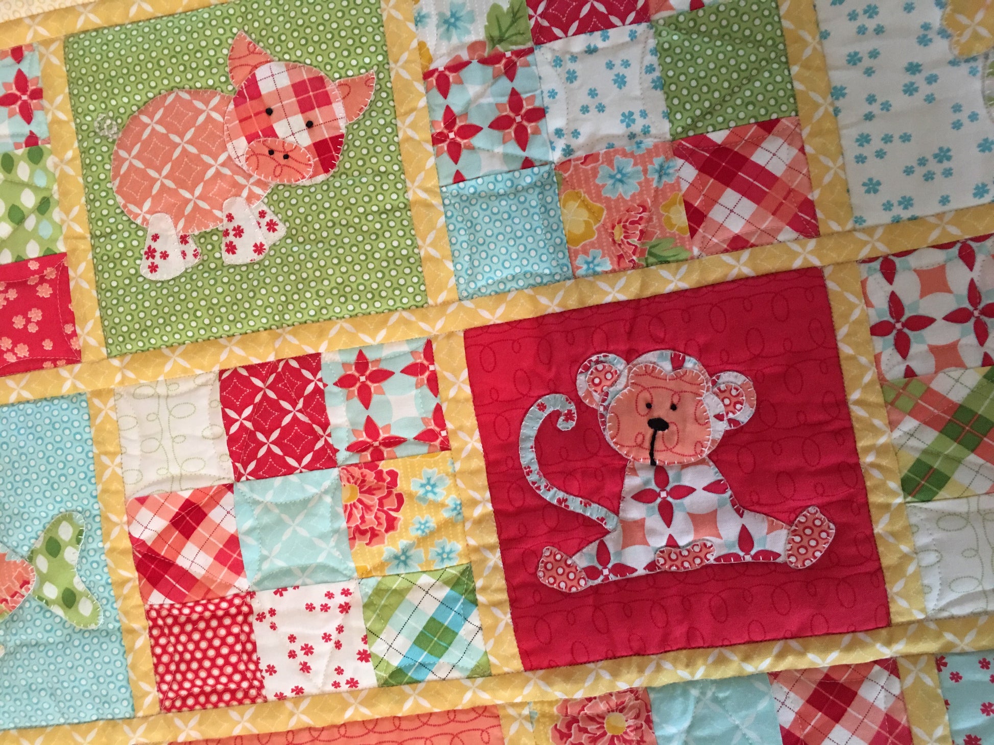 Colorful applique animals and 9-patch blocks come together in this ADORABLE baby or toddler blankie. Made from a Layer Cake, just choose a fabric line you like and you're set to sew!