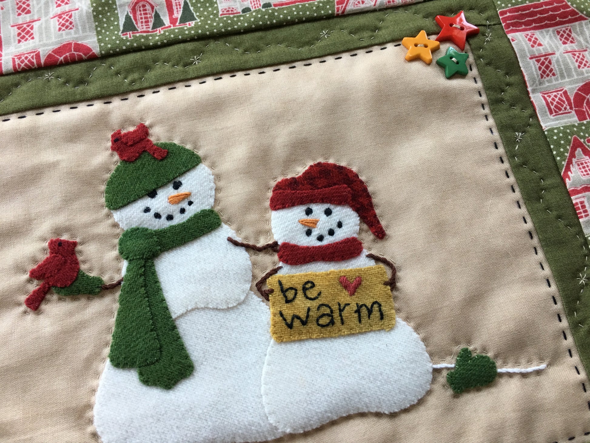 Love and warmth between snowman friends and cardinals. Sweet little applique project, with instructions to finish as either a pillow or a wall hanging.