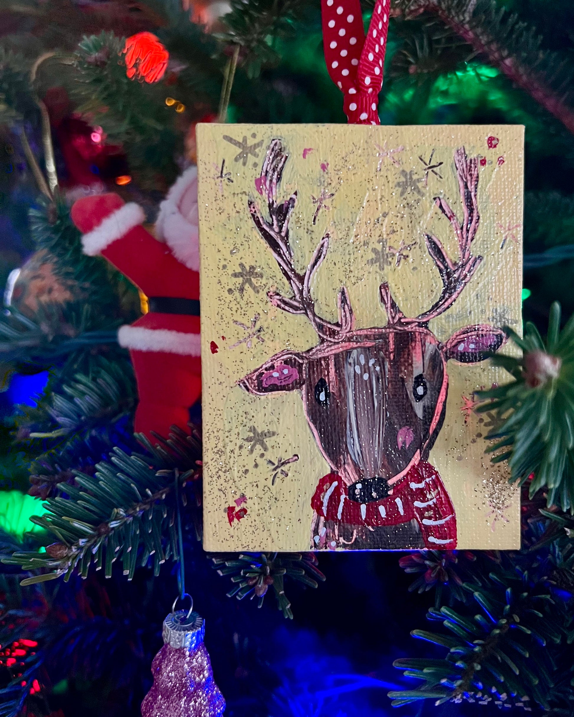 Each 3"x4" canvas ornament is an original. Acrylic paint, glitter (lots of shimmer!), and glossy varnish, topped with a red polka dot or black ribbon hanger.