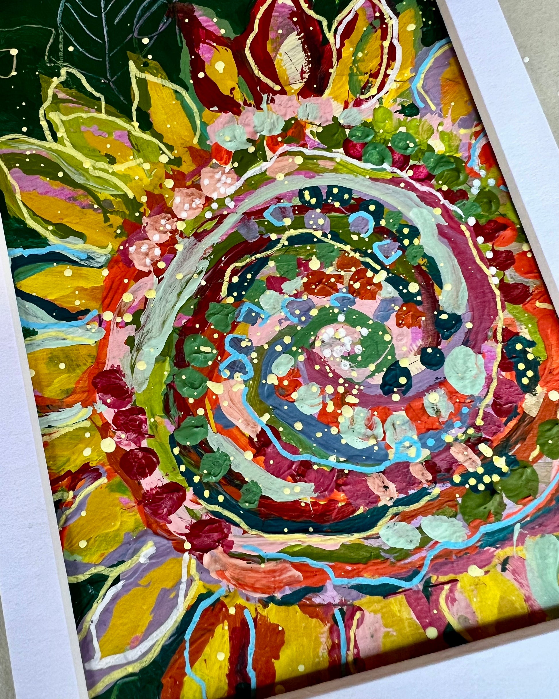 Painting itself is approximately 4.75"x6.75". Narrow white mat brings it up to an even 5"x7". Acrylic paint and acrylic pen on high quality, 140 lb, watercolor paper.