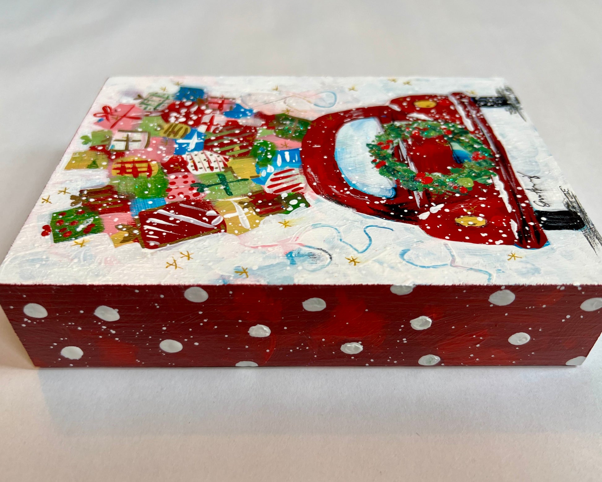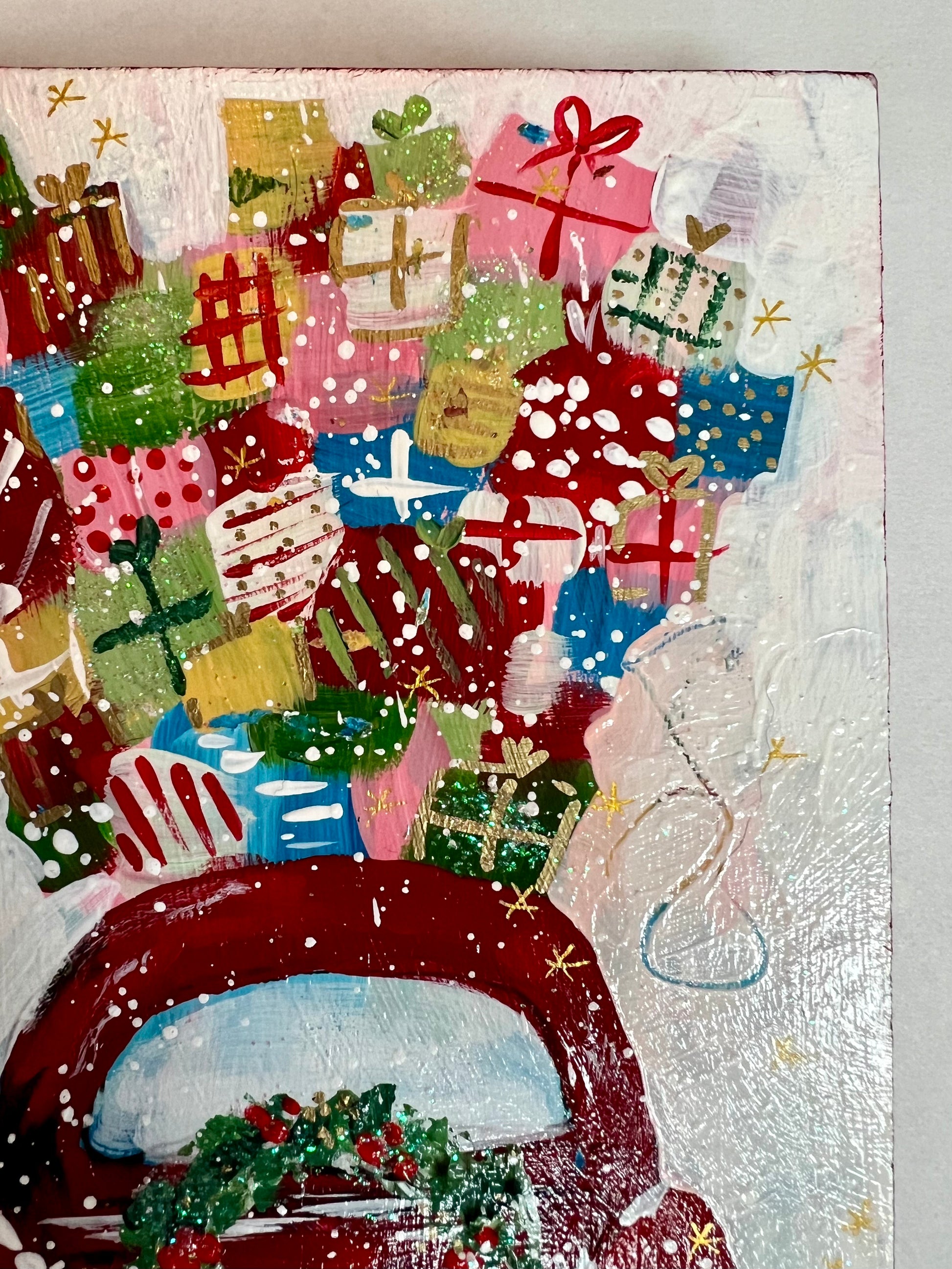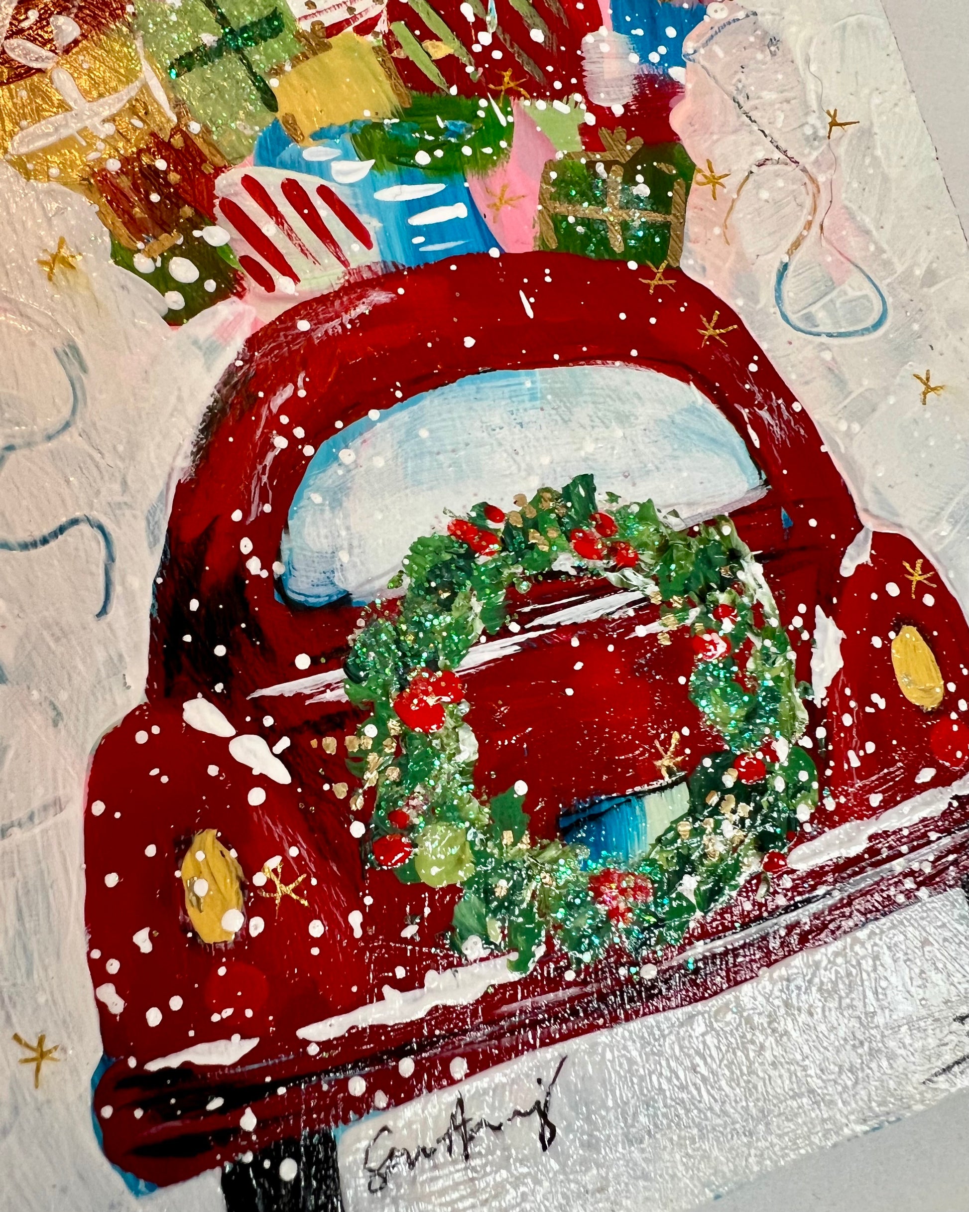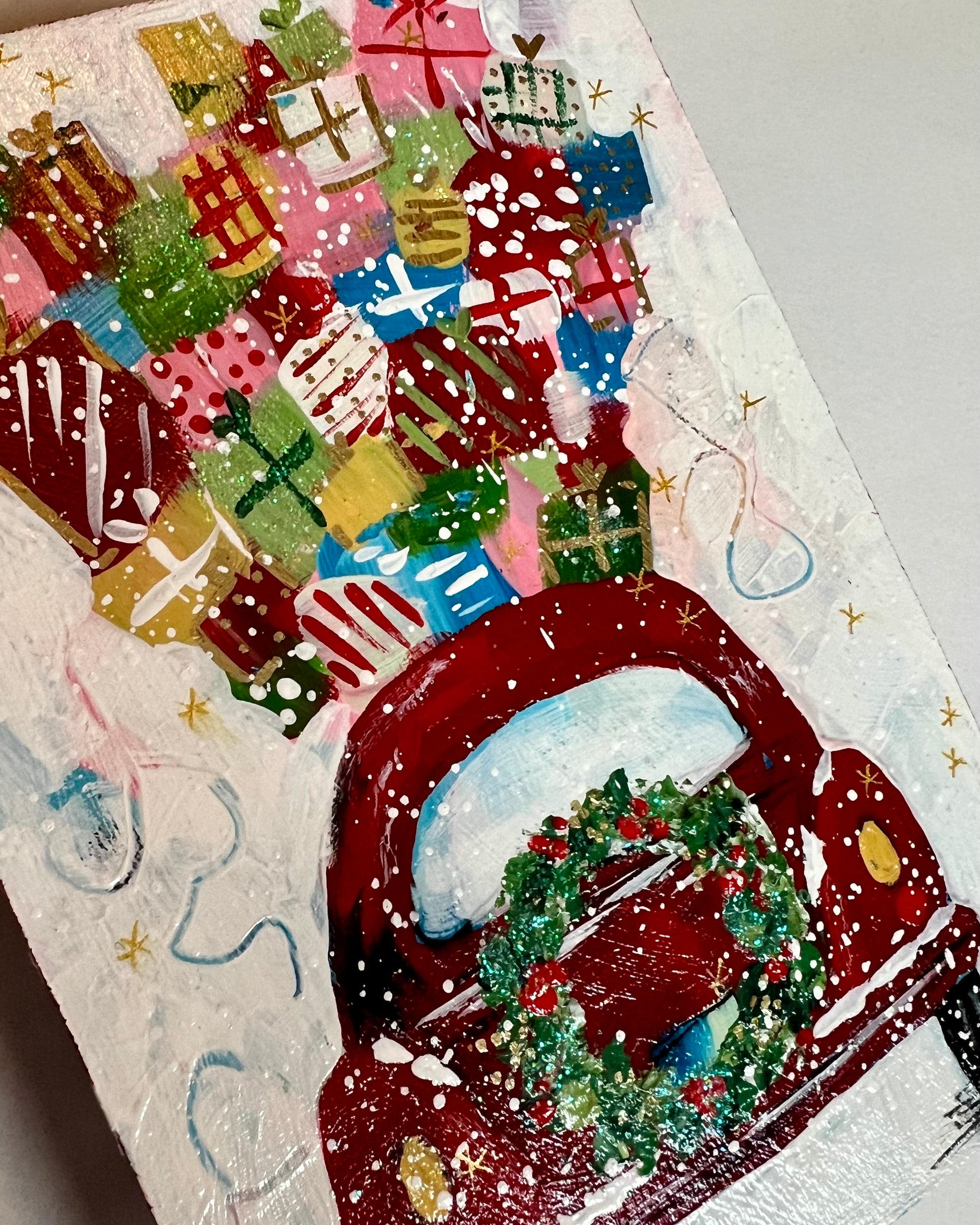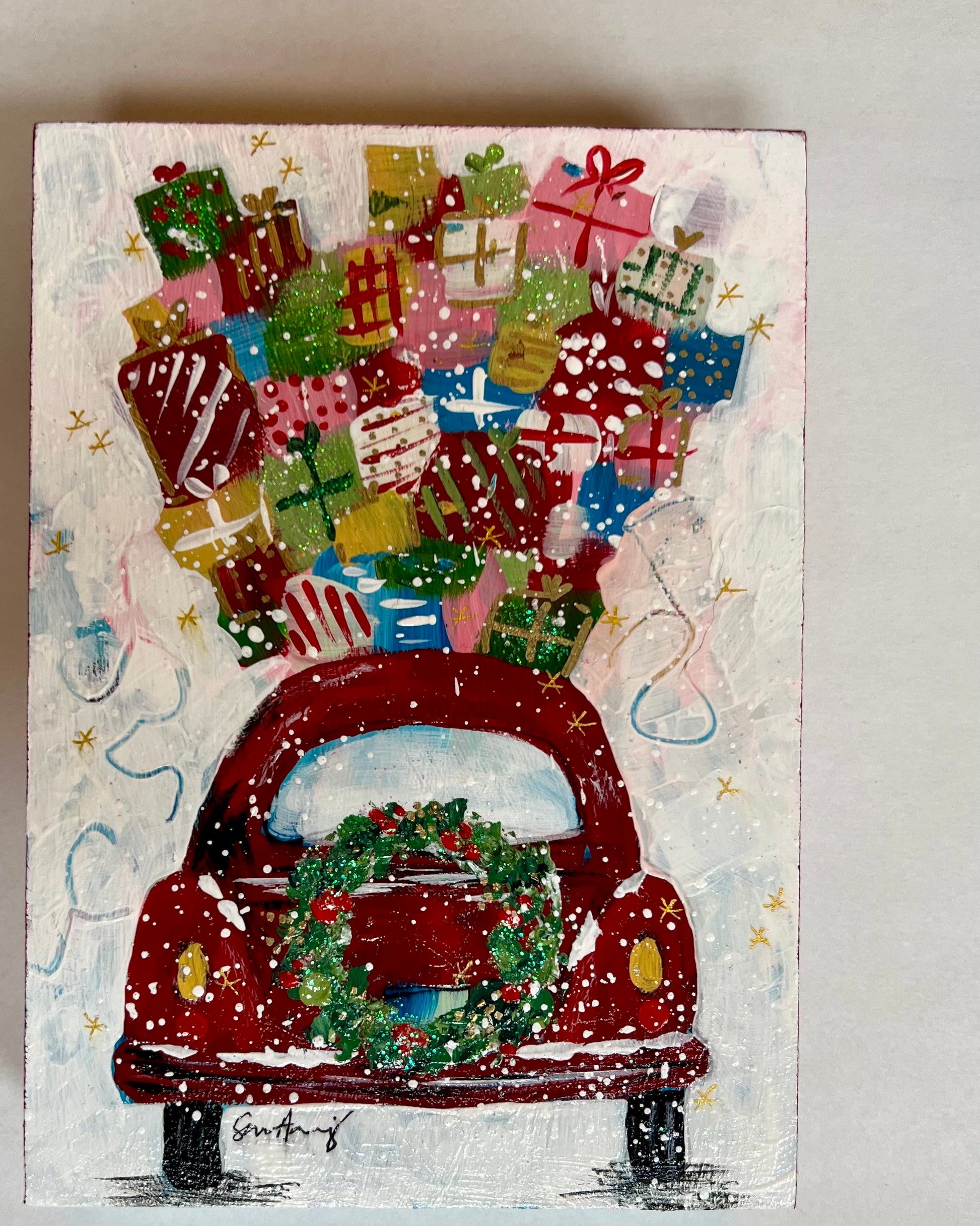 These joyful, colorful, present-ful paintings are the full expression of the season! Remember being a kid and the anticipation of those glittery gifts below the tree? My family traveled to Grandma's house for a boisterous and very giving Christmas Eve. And while our vehicle didn't QUITE look like this, the spirit is reflected!