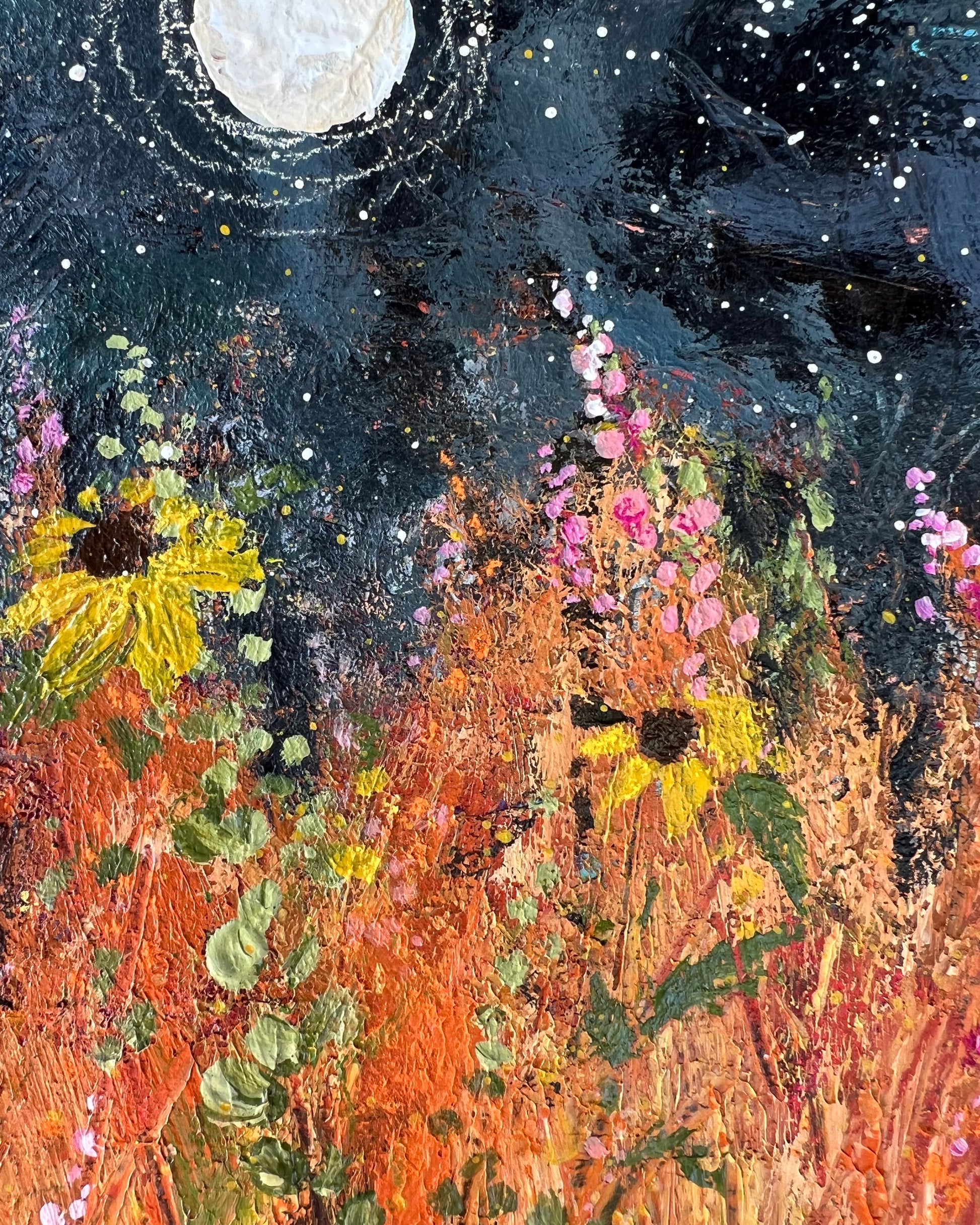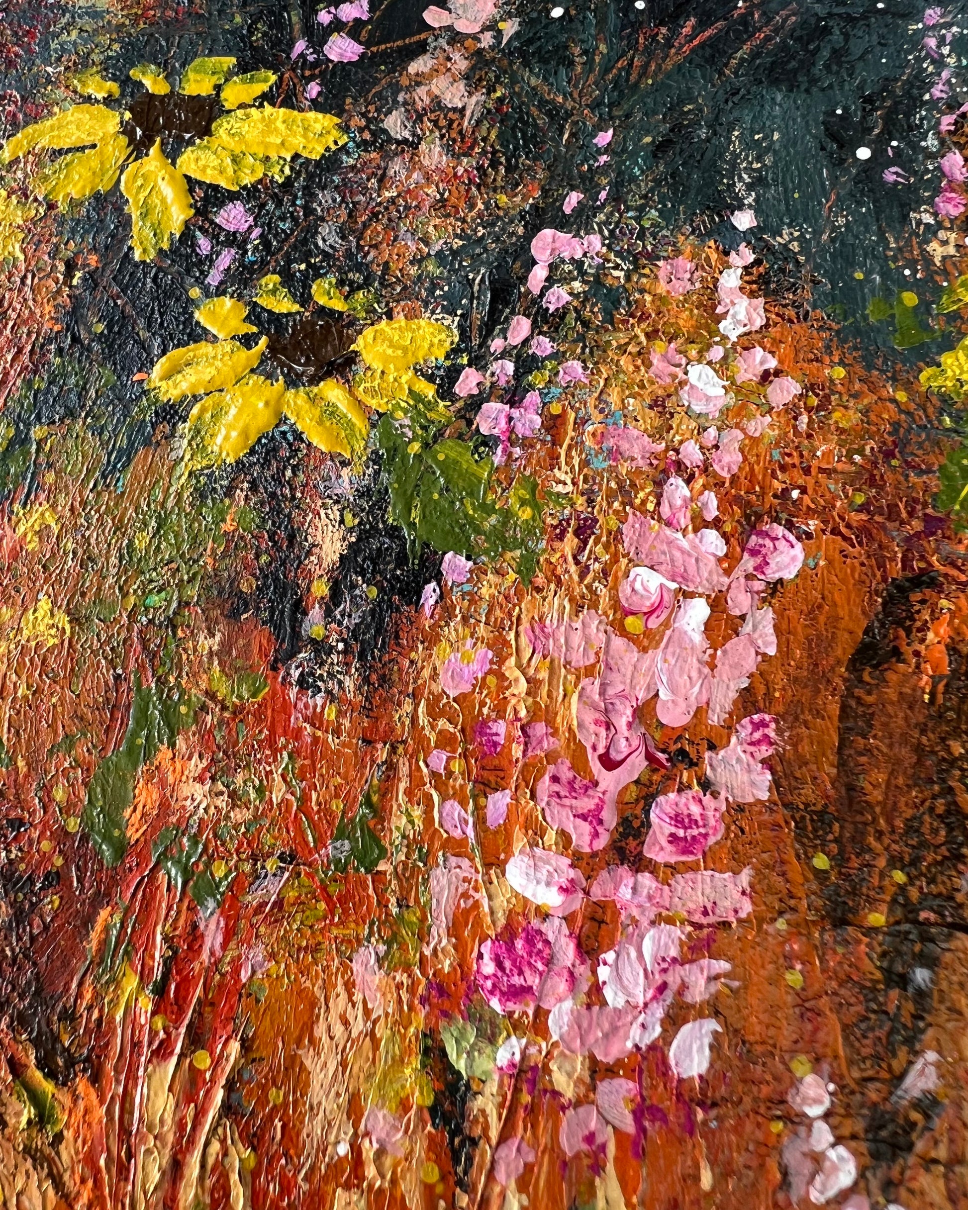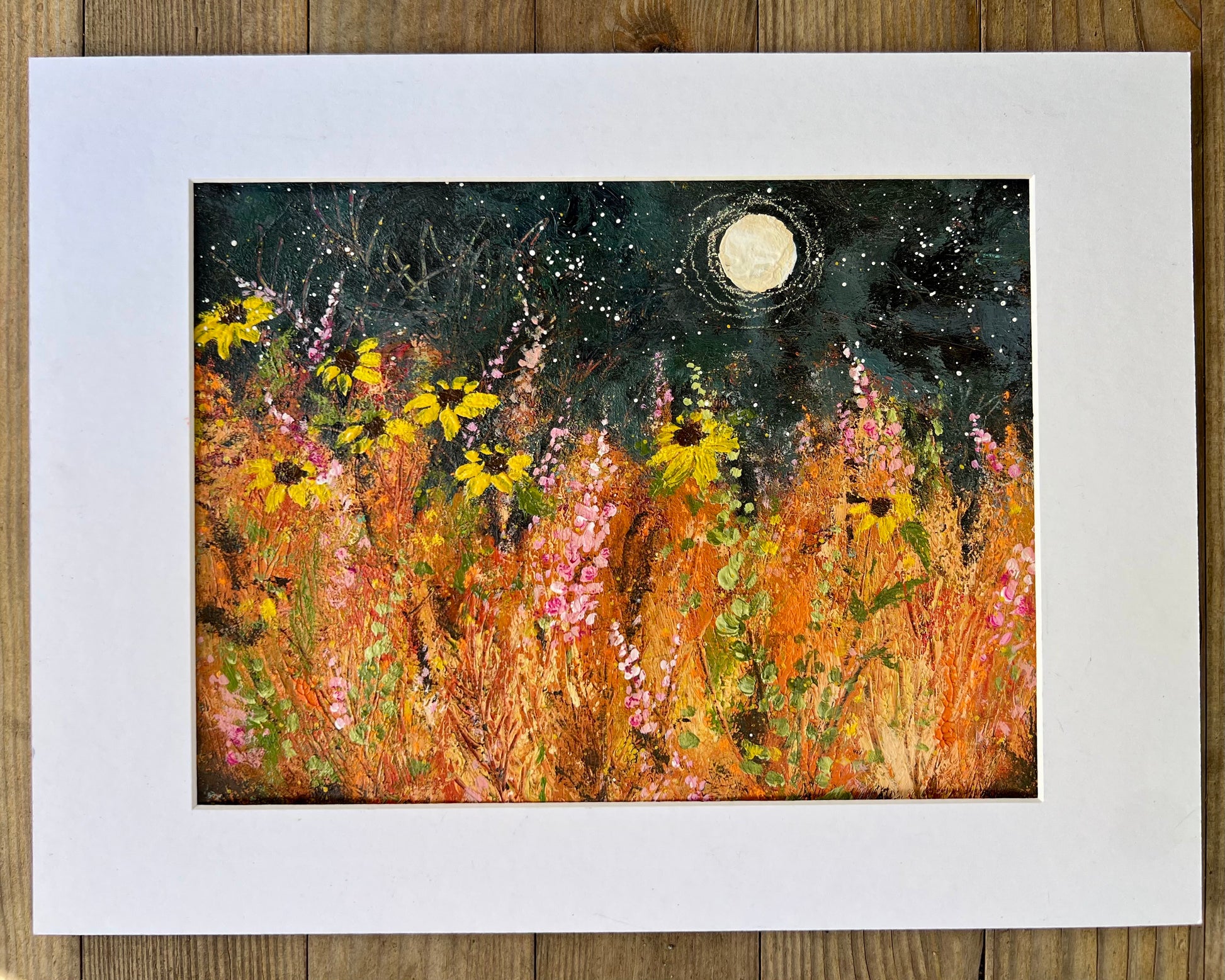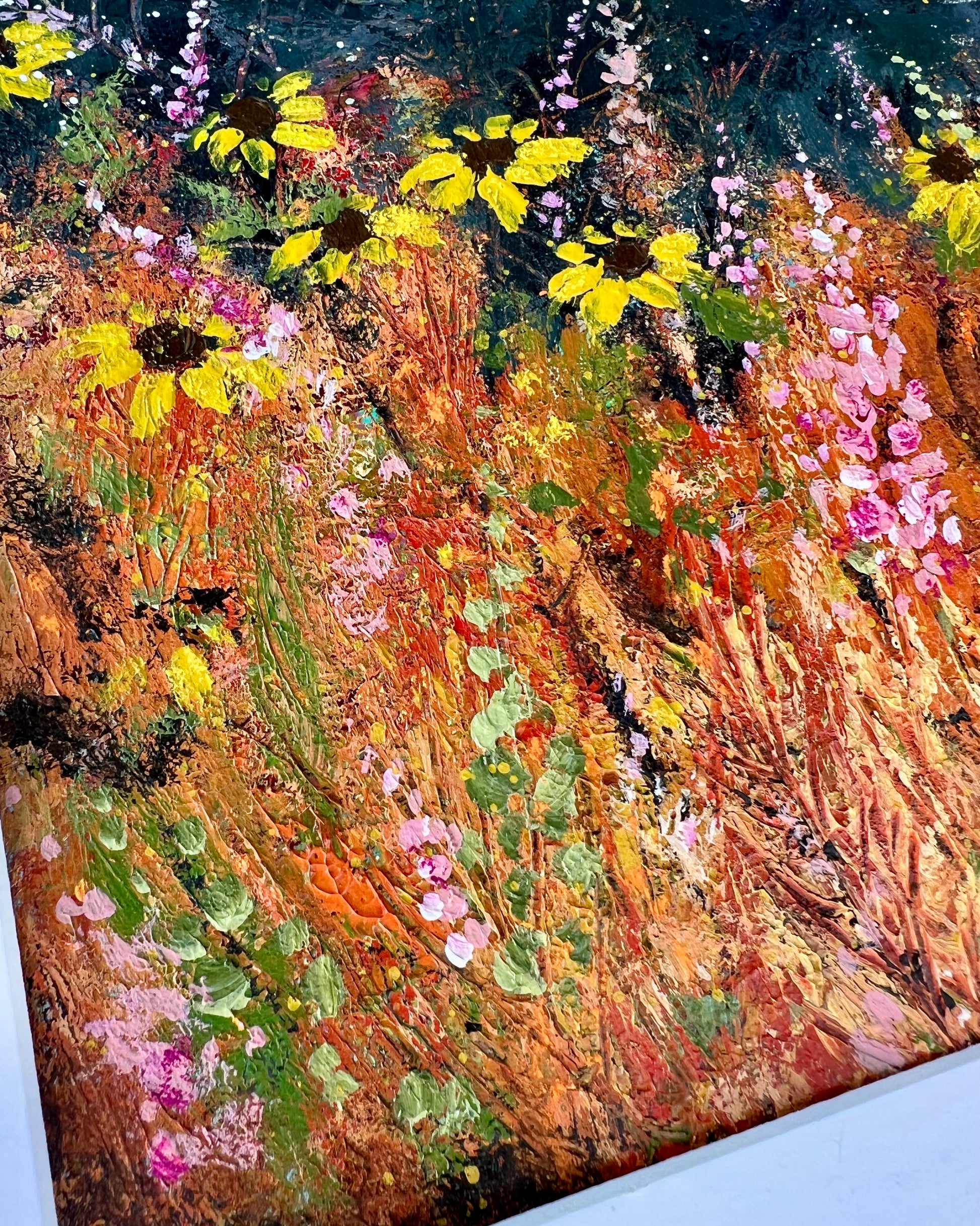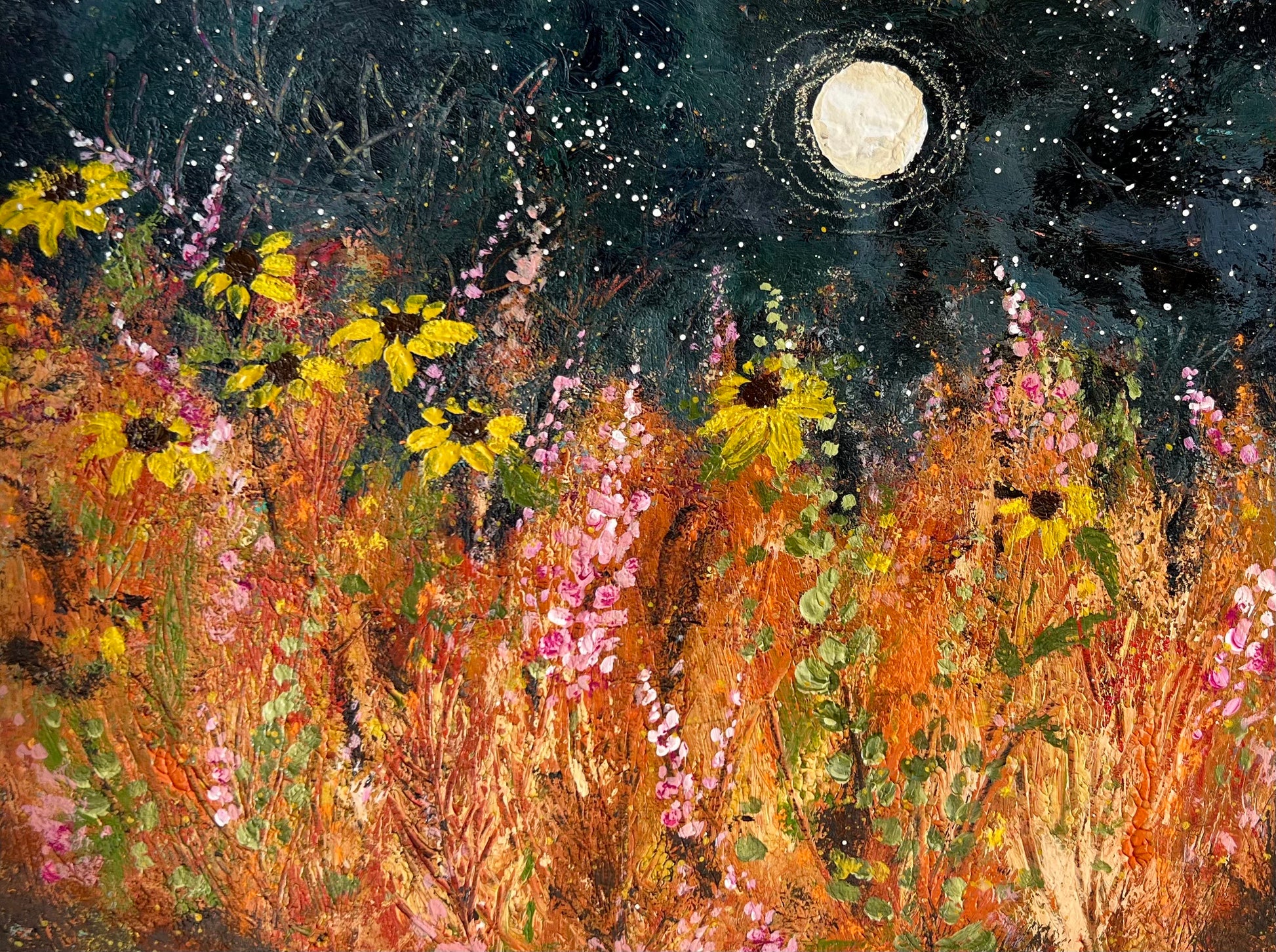 From my Harvest Moon Collection. When night falls, sunflowers orient themselves to the east in anticipation of the morning sun. In this piece, I imagine the flowers doing just that. Scattered among them are pink wildflowers and the last greens of summer.