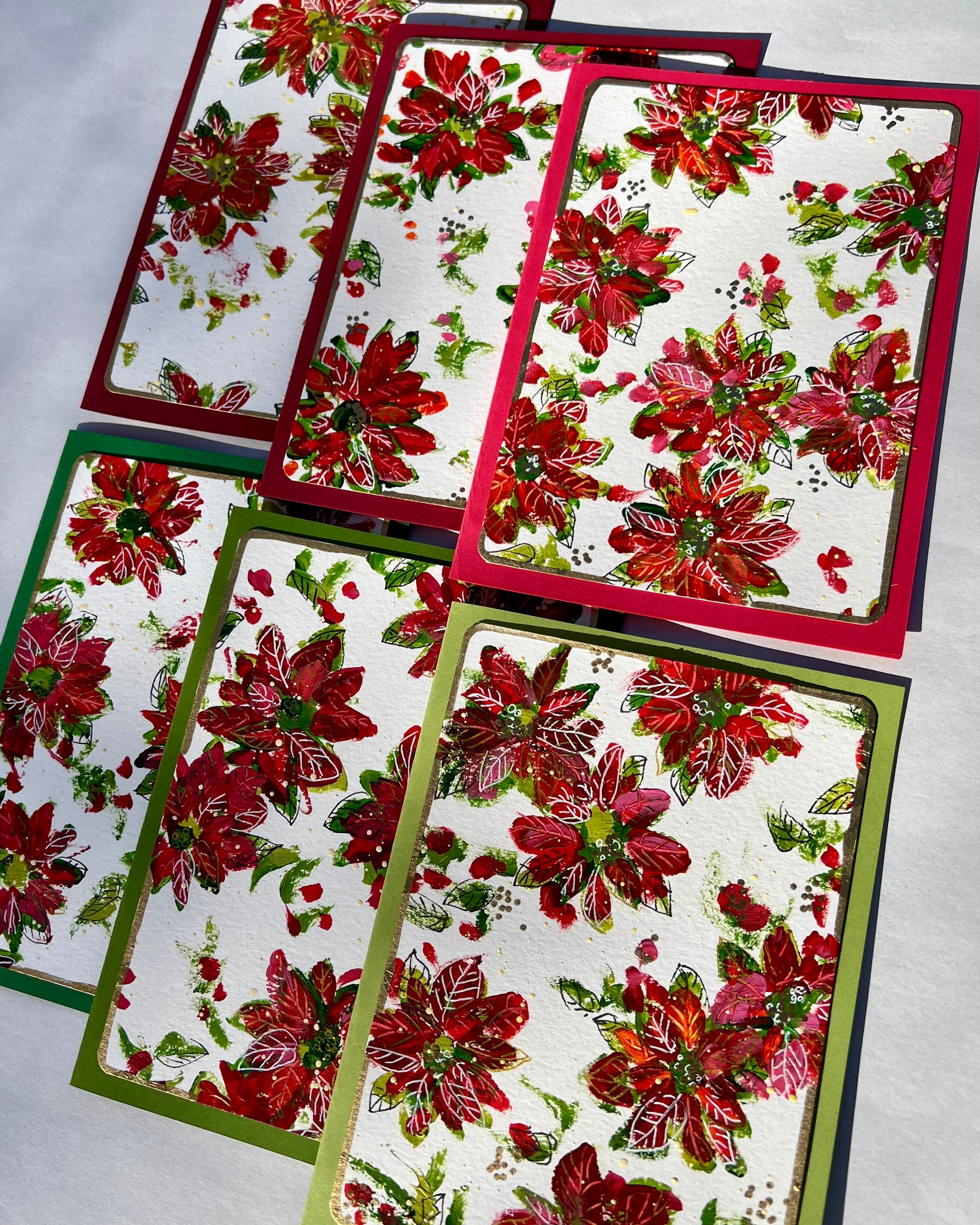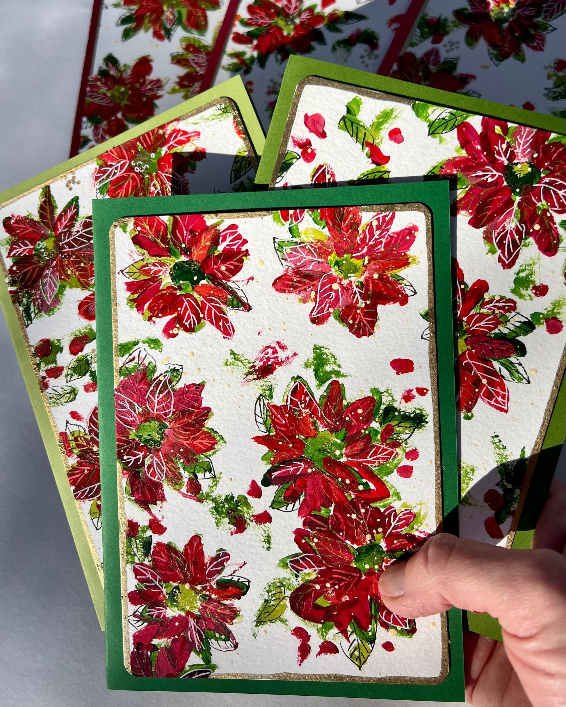 Acrylic paint atop high quality artist paper, added line work, and gold pen embellishments give shimmer to each card. Painting is 4 1/2"x6", secured to a 5"x7" red or green card, blank white inside, envelope included. Note that each card is unique, and I've mounted them on various shades of red and green.