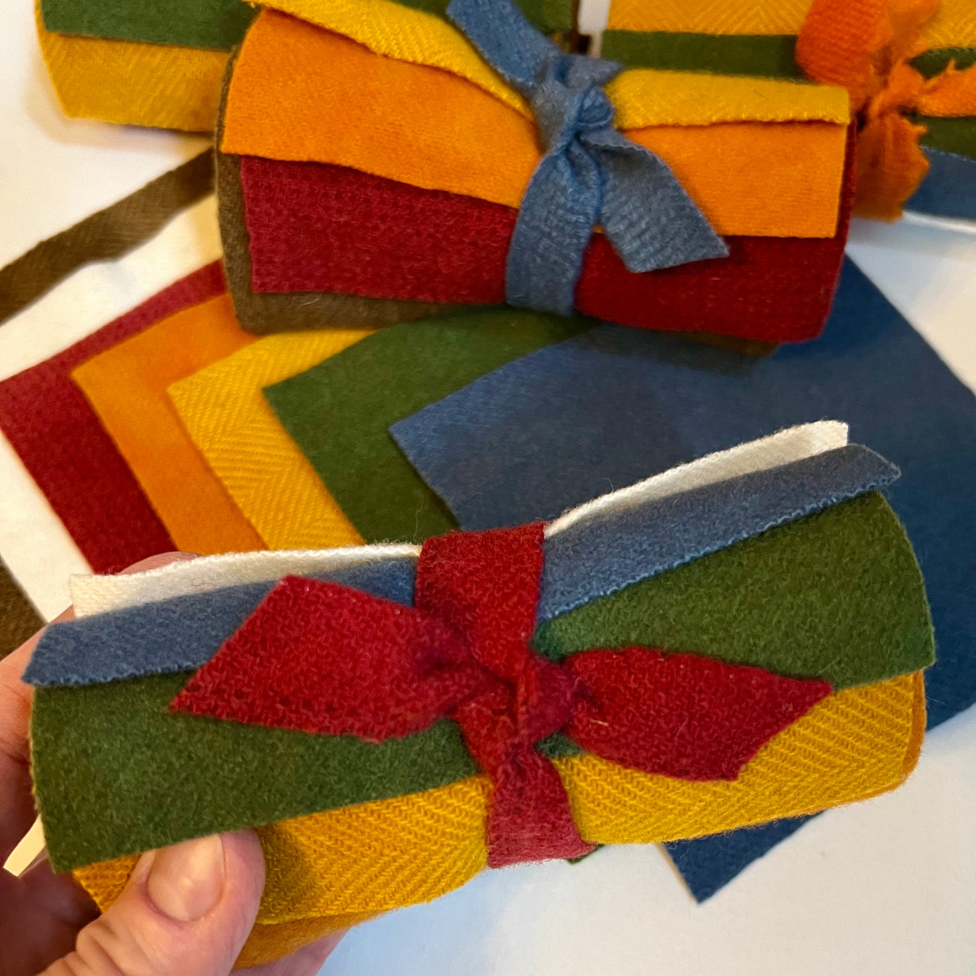 Looking for a nice little sampling of wool? This bundle contains seven 5" square pieces in a great variety of colors. Brown, Whitish, Red, Orange, Gold, Green, and Blue. Brown, Red and Gold have a light texture/pattern to them. You will receive the exact wools pictured here, colors that I've used throughout many of my patterns in wool applique.